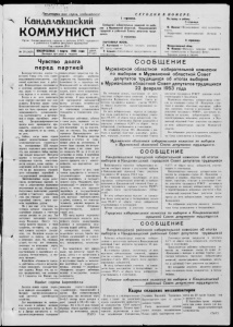 Пролетарии всех стран-, соединяйтесь) Кандалакшский С Е Г О Д Н Я & Н О М Е Р Е ; 1 страница. КОММУНИСТ Сообщения избирательных комиссий по выбо рам в Мурманский областной, Кандалакшский городской и районный Советы депутатов трудя щихся. 2 страница. Орган Кандалакшского горкома и райкома КПСС, городского ПАРТИЙНАЯ Ж1/Пі-Ік и районного Советов депутатов трудящихся ІІА гІИ И пА л /пИопЬ. Год издания 23-й Е. Карташова Iлуооко 11 .»\ чaі ь ]ic 1111 *н 11 и XIX съезда партии. По городу и району. 3 страница. М. Мокина — Недооценивают гнлу коллектива класса. Осуществить политехническое обучение и школах. 4 страница. № 26 (3428) ВОСКРЕСЕНЬЕ, 1 марта 1953 года Выходит три раза в неделю ЦЕНЯ 15 коп. Р. Ефимов — Упел потноводетпа. чинаіот ироду ктпвность жп- Международный обзор. М. Яновлев —Началось широкое экономиче ское строительство в Народном Китае. Торговли детьми в Англин. Чувство долга перед партией Коммунистическая партия Со ветского Союза есть союз едпно- мышлешшков-коммуішстов, спа янный единством волн и дейст вий. Непоколебимая сплоченность и железная дисциплина партий ных рядов — источник могуще ства партии и ее великих, побед. Всегда и во всем выполнять полю партии— высший долг ком муниста. Почетное звание члена Коммунистической партии обязы вает его быть примером дисцип линированности, организованно сти, настойчивости, в претворе нии н жизнь партийных реше нии. Дисциплинированностью прежде всего проверяется пре данность коммуниста своей пар тии, преданность не на словах, а па деле. Сейчас, когда наша страна решает величественные задачи коммунистического строительст ва, поставленные XIX съездом партии, передовая роль коммуни ста, как активного бойца партии, еще больше возрастает. Интересы партии ті государства требуют повышения чувства ответствен ности каждого члена партии за порученное делѴ» на каком бы по сту он ни находился, строжай шего соблюдения партийной и государственной дисциплины. .Многочисленные кадры работ ников, воспитанные партией, че стно и добросовестно выполняют возложенные на них обязанности. Безусловное выполнение решений партии и Советского правитель ства они считают делом своей партийной совести, своим выс шим партийным долгом. Но у нас еще есть такие ра ботники, которые полагают, что партийные решения и советские законы писаны не для них. Так поступает начальник торгового порта Филиппов. Вместо того, чтобы навести порядок в своем хозяйстве, поставить на долж ный уровень трудовую дисцип лину, тон. Филиппов нередко сам нарушает ее, выходя на работу в нетрезвом виде. Он, очевидно, думает, что ему все позволено, поскольку он начальник порта, то может не. считаться с госу дарственными и партийными по рядками, бесчинствовать и тво рить произвол. Первейшая обязанность каждо го работника— строго и неукосни тельно выполнять государствен ные задания. Между тем. на та ких предприятиях, как лесозавод •V 7 (директор тов. Попов), гор- инщекомбинат (директор тов. До- рожкпн), лесозавод рыбпрома (директор тов. Баранкевнч), хле бокомбинат (и. о. директора тов. Паннкаровскнп) не обеспечивает ся выполнение производственных планов, имеет место неравномер ный выпуск продукции в тече ние месяца. У ряда руководите лей предприятий наблюдаются факты поставки потребителям недоброкачественных изделии, не отвечающих установленным стандартам н техническ