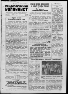 Пролетарии всех стран, соединяйтесь! м и а я л а к ш с к и й Н О П П У Н И С Т Орган Кандалакшского городского и районного комитетов КПСС, городского и районного Советов депутатов трудящихся № 41 (4221) Год изд. 28-йІ СРЕДА, 2 а п р е л я 1958 го д а ЦЕНА 15 коп. — Первая сессия — Верховного Совета СССР На заседаниях Совета Союза 29 марта и Совета Нацио нальностей 31 марта продолжались прения по докладу тов. Н. С. Хрущева о дальнейшем развитии колхозного строя и реорганизации машинно-тракторных станций. Выступившие в прениях депутаты горячо поддерживали мероприятия Коммунистической партии по дальнейшему подъ ему сельского хозяйства. Они вносили много ценных предло жений и замечаний, направленных на более полное исполь зование резервов в сельскохозяйственном производстве, улуч шение производственно-технического обслуживания колхозов, совершенствование деятельности советских и сельскохозяйст венных органов по руководству сельским хозяйством. В 3 часа дня 31 марта в Большом Кремлевском Дворце открылось совместное заседание Совета Союза и Совета На циональностей Верховного Совета СССР. Горячими аплодисментами депутаты и гости встречают появление в правительственных ложах руководителей Комму нистической партии и Советского государства. С заключительным словом по докладу о дальнейшем раз витии колхозного строя и реорганизации машинно-тракторных станций выступает тепло встреченный участниками заседания тов.. Н. С. Хрущев. Верховный Совет СССР единогласно при нимает Закон о дальнейшем развитии колхозного строя и ре организации машинно-тракторных станций. Затем .сессия перешла к вопросу об образовании Пра вительства СССР— Совета Министров СССР. Верховный Совет СССР единогласно утвердил предложенный Председателем Со вета Министров СССР тов. Н. С. Хрущевым состав Совета Министров СССР. Первыми заместителями Председателя Сове та Министров СССР утверждены депутаты: Ф. Р. Козлов, А. И. Микоян, заместителями Председателя Совета Минист ров СССР— депутаты А. Н. Косыгин, А. Ф. Засядько, И. И. Кузьмин, Д. Ф. Устинов. После этого Верховный Совет СССР приступил к рас смотрению вопроса о прекращении испытаний атомного и водородного оружия. С заявлением от имени Советского пра вительства выступил Министр иностранных дел СССР депу тат А. А. Громыко. Все выступавшие единодушно поддержали заявление Со ветского правительства об одностороннем прекращении испы таний атомного и водородного оружия. Верховный Совет единогласно принимает постановление по вопросу об одностороннем прекращении Советским Союзом испытаний атомного и водородного оружия. Затем принимается Обращение Верховного Совета к кон грессу Соединенных Штатов Америки по вопросу о прекра щении испытаний ядерного оружия. Подобные Обращения при нимаются также к парламенту Великобритании, к бундестагу Федеративной Республики Германии, а также к парламентам всех стран мира. Сессия принимает постановление, которым поручается председателям палат Верховного Совета СССР обратиться от имени Верховного Совета СССР к парламентам государств — участников антигитлеровской коалиции и стран, пострадав ших от гитлеровской агрессии в годы второй мировой вой ны, с призывом объединить усилия в целях предотвращения атомного и ракетного вооружения Федеративной Республики Германии. Повестка дня исче