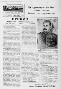 о с' - чѵлі.’ <г С М-■' JJOUO ? ’ \jUL. П р о л ет а р и и ш х ст ран , соединяйт есь} о м м ѵ н ш п т Каядалакілского Горкома и Райкома ВКП(б), н Районного Советов депутатов трудящихся Год издания XV Городского № й : і { 2202 ) В т о р н и к 1 м а я 1945 г. 1 Ч еш Выховтп 0 среду, пятницу и воскресенье J 15 к. Да здравствует 1-е Мая — день смотра боевых сил трудящихся! П Р И К А З Верховного Главнокомандую щег о I Мая 1945 года № 20 г. Москва Товарищи красноармейцы и краснофлот­ цы. сержанты и старшины, офицеры армии я флота, генералы и адмиралы! Трудящиеся Советского Союза! Сегодня наша страна празднует Первое Мая—между народный праздник трудящихся . В этом, году народы нашей Родины встре­ чают день Первого Мая в обстановке иобе- д о і іос ног о •/; і верн f е е іия в ел ик*> й От ечес т вен- ной войны. Ушли в прошлое и не вернутся больше тяжелые времена, когда Красная Армия от­ бивалась от вражеских войск под Москвой и Ленинградом, под Грозным и Сталинградом. Ныне наши победоносные войска громят во­ оруженные силы противника в центре Гер­ мании, далеко за Берлином,на реке Эльба.” З а короткий срок освобождены Польша, Венгрия, большая часть Чехословакии, зна­ чительная часть Австрии , столица Австрии —Вена. Красная Армия овладела при этом—Вос- точной Iір у с с и е й ...гнездом немецкого импе­ риализма-, Померанией, большею мастью Бранденбурга и главными районами столи­ цы Германии—Берлина, водрузив над Бер­ лином знамя победы. В результате этих наступательных боев Красной Армии немцы потеряли в течение 3—4 месяцев более 800 тысяч солдат и офи­ церов пленными и около миллиона убитыми. За это же время части Красной Армии зах­ ватили и уничтожили до 6 тысяч вражес­ ких самолетов, до 12 тысяч танков и само­ ходных орудий, более 2а тысяч полевых орудий и огромное количество дру гих ви­ дов вооружения и снаряжения. Следует отметить, что в этих боях б ок о бок с Красной Армией успешно .наступа­ ли против общего врага польские, югослав­ ские, чехословацкие, болгарские и румын­ ские дивизии. В результате сокрушитель­ ных ударов Красной Армии немецкое коман­ дование оыло вынуждено перебросить на со­ ветско-германский фронт десятки дивизий, оголяя целые участки на других фронтах. Это обстоятельство помогло войскам наших союзников развернуть успешное наступле­ ние на западе. ІІри атом путем одновремен­ ных ударов против немецких войск с восто­ ка к запада войскам союзников и Красной Армии удалось рассечь немецкие войска на две, оторванные дру г от друга , части и осу ­ ществить соединение наших н союзных войск в единый фронт. Не может быть сомнения, что э т о обстоя­ тельство означает конец гитлеровской Гер­ мании. Дни гитлеровской Германии сочтены. Более половины ее территории занято Крас ­ ной Армией и войсками наших союзников. Германия лишилась важнейших жизненных районов. Оставшаяся [в руках гитлеровце)! промышленность не может снабжать немец­ кую армию достаточным количеством воору­ жения, боеприпасов и горючего.Людские ре ­ зервы немецкой армии исчерпаны. Герма­ ния полностью изолирована и оказалась и одиночестве, если не считать ее союзницы —Японии. В поисках выхода из своего безнадежного положения гитлеровские авантюристы идут на всевозможные фокусы вплоть до заигры­ вания с союзниками, стремясь вызвать раз­ лад в лагере H r и новы* жульнические тр к о а ~і лтдерегдов об­ речены 