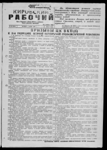 ет< .Обязательный экз< ’i !. ,1 ; 'к г' i ! ■ МУРМАНСК, " " " v \ Щ Областной центральной библиотеке. *' h ' ! " I : : 1.1 ! I . ; • .1 ЭКЗ.- К И У P A I G ш рш т а ш Орган Кировского райкома ВКП(б) и районного Совета депутатов трудящихся № 45 (3579) ЧЕТВЕРГ, 4 ноября 1948 г. W'W Год г издания XVIII Цена !S коп. Да* здравствует великая партия большевиков,—партия Ленина— Сталина, закаленный в боях авангард советского народа, вдохновитель и организатор наших побед! Под знаменем Ленина, под водитель­ ством Сталина, вперед, к победе ком ­ мунизма ! й годовщине Великой Октябрьской (Из Призывов ЦК социалистической ВКН(б) к 31- революции) Р И З Ы ВЫ Ц К В К П ( б ) К 31-й ГОДОВЩИНЕ В ЕЛИШ 1 ОКТЯБРЬСКОЙ СОЦИАЛИСТИЧЕСКОЙ РЕВОЛЮЦИИ 1. Да здравствует 31-я пшиштна. ййликлй гЪтайтЖ;» ^ 31-я годовщина Великой Октябрьской социалистической борющимся за победу народов демократии и со- в их борьбе против надежный оплот трочный мир мира отстоявшим завоевания юду и' независимость руоежи Социалистического Труда — к новым за даль- народов нашей а революции! 2. Братский привет народам, циализма! 3. Да здравствует дружба, и сотрудничество фашизма — за победу народной демократии! 4. Трудящиеся всех стран! Разоблачайте агрессивные замыслы иоджнгате- лей новой войны! Сплачивайте силы демократии в борьбе за и безопасность народов! 5. Да здравствует великий Советский Союз — и безопасности, свободы а независимости народов! 6. Слава Вооруженным Силам Советского Союза, Великой Октябрьской социалистической революции, народов нашей Родины! •7. Советские^ воины! Неустанно повышайте свои военные и политические знания, осваивайте опыт’ Великой Отечественной войны, совершенствуйте свое боевое мастерство, крепите мощь Вооруженных Сил Советского государства! 8. Да здравствуют советские пограничники, зорко охраняющие нашей Родины! 9. Слава Героям Советского Союза и Героям лучшим сынам н дочерям нашей великой Родины! 10. Рабочие, крестьяне, интеллигенция Советского Союза! Вперед победам в борьбе за восстановление н развитие народного хозяйства нейший под’ем материального благосостояния и культуры страны! 11. Слава рабочим п работницам, инженерам и техникам передовых пред­ приятий, досрочно выполнившим план третьего решающего года новой пятилетки! 12. Трудящиеся Советского Союза! Боритесь за строжайшую экономию и сверхплановые накопления во всех отраслях народного хозяйства! Снижайте! себестоимость и улучшайте качество продукции, повышайте производительность >0i труда! 13. Рабочие и работницы, инженеры и техники угольной промышленности! Повышайте добычу угля, лучше используйте механизмы! Быстрее восстанавли­ вайте и стройте новые шахты! Осваивайте опыт шахтеров — Героев Социали­ стического Труда! Полностью обеспечим топливом хозяйства! '14. Рабочие и работницы, инженеры и техники нефтяной промышленности! j Выше темпы добычи и переработки нефти! Быстрее осваивайте повью место-1 рождения! Больше нефтепродуктов для народного хозяйства! 15. Рабочие и работницы, инженеры и техники металлургической промыш­ ленности! Боритесь за новый мощный под’ем производства, металла! Повышайте рентабельность предприятий! Дадим народному хозяйству больше чугуна, стали, проката, цветных металлов! 16. Рабочие и работницы, инженеры ц техники электростанций! Быстрее вводите в действие новые энергетические мощности! Осваивайте передовую техн