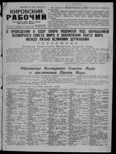 Пролетарии всех стран, соединяйтесь! о КИРОВСКИИ„ РЯБОЧИИ Орган Кировского райнома ВКП(б) и районного Совета депутатов трудящихся Год издания XXI Л 43 (3753) ЧЕТВЕРГ, 6 сентября 1 9 5 1 г. Цена 15 коп. О Ь Я ,Ь ИБ К А 28 августа в Москве состоялся пленум Советского Комитета защиты мира. Выражая готовность советских людей отстаивать справедливое дело мира и дружбы между народами, пленум признал необходимым начать в сентябре 1951 года сбор подписей под Обращением Всемирного Совета Мира о заключении Пакта Мира между пятью великими державами. Подписываясь под Обращением Всемирного Совета Мира, кировчане еще раз подтвердят свою готовность всеми силами отстаивать под руковод ством партии Ленина—Сталина дело мира и безопасности народов, вновь продемонстрируют свою беззаветную преданность великому знаменосцу мира товарищу Сталину. О ПРОВЕДЕНИИ В СССР СБОРА ПОДПИСЕЙ ПОД ОБРАЩЕНИЕМ ВСЕМИРНОГО СОВЕТА МИРА О ЗАКЛЮЧЕНИИ ПАКТА МИРА МЕЖДУ ПЯТЬЮ ВЕЛИКИМИ ДЕРЖАВАМИ Пл е н у ма Со Пленум Советского Комитета защитымира единодушно поддерживает Обращение Всемирного Совета Мира о за ключении Пакта Мира между пятью великими держава ми—США, Англией, Францией, Китаем и СС Р. Это обращение, выражающее волю и желания миро любивых народов всех стран, встречено горячим одоб рением советских людей, заинтересованных в прочном и длительном мире и готовых до конца отстаивать епра- ^ ведливое дело мира и дружбы между народами. Е 3 О в е т с к о г о Л Ю Ц И К о м и т е т а Я Растущая угроза новой войны поднимает все оолее широкие массы народов всех стран на решительную борьбу за сохранение мира. Около 450 миллионов под писей под Обращением Всемирного Совета Мира, уже со бранных во всех странах мира, свидетельствуют о не преклонной воле народов предотвратить войну и отстоять дело мира во всем мире. Пленум Советского Комитета защиты мира считает необходимым начать в сентябре 1951 г. сбор подписей в Советском Союзе под Обращением Всемирного Совета з ащи т ы мира Мира о заключении Пакта Мира между великими дер жавами и призывает всех советских людей поставить своп подписи под этим Обращением. Советский Комитет защиты мира выражает твердую уверенность в том. что все советские люди откликнутся па этот призыв и тем самым еще раз подтвердят сфю готовность всеми силами отстаивать под руководством партии Ленина— Сталина дело мира и безопасности На родов, вновь продемонстрируют свою беззаветную пре данность великому знаменосцу мира товарищу Сталину. С О В Е Т С К И М Н О М И Т Е Т З А Щ И Т Ы М И Р А . Обращение Всемирного Совета Мира о заключении Пакта Мира Отвечая стремлениям миллионов людей во всем мире, каково бы ни было их мнение о причинах, порождающих опасность мировой войны;' во имя укрепления мира и обеспечения международ ной безопасности; мы требуем заключения Пакта Мира между пятью великими державами— Соединенными Штатами Америки, Советским Союзом, Китайской Народной Республикой, Великобританией и Францией. Мы будем рассматривать отказ правительства любой из великих держав от встречи в целях заключения Пакта Мира как свидетельство агрессивных замыслов этого пра вительства. Мы призываем все миролюбивые страны поддержать требование о заключенииПакта Мира, открытого для всех государств. Мы ставим своп подписи под этим Обращением и призываем подписать его всех людей добр