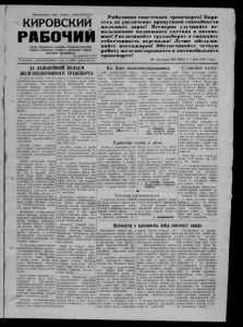 КИРОВСКИЙ РАБОЧИЙ Орган Кировского райкома Коммунистической партии Советского Союза и районного Совета депутатов трудящихся Год издания XXIII X 62 (3922) | ВОСКРЕСЕНЬЕ, 2 августа 1953 г. I Цена 10 кои. Пролетарии всех стран, соединяйтесьI Р аботники с о в е т с к о г о тр ан сп ор т а ! Б ори ­ т е с ь з а ув елич ени е пропускной сп о с о б н о с т и ж е л е зн ы х дорог ! В сем ерн о улучш айте и с ­ п оль зов ани е п одвиж н о го с о с т а в а и ав том а ­ шин! У неличивайте г р у з о о б о р о т и сн иж а й т е с е б е с т о и м о с т ь п ер ев о зок ! Лучше о б с л уж и ­ в ай т е п а с с аж и р о в ! О б е сп ечи в ай т е четкую р а б о т у ж е л е зн о д о р ож н о г о и автом обильного тр ан сп ор т а ! (Из Призывов ЦК КПСС к 1 Мая 1953 года). ЗА ДАЛЬНЕЙШИМ ПОДЪЕМ ЖЕЛЕЗНОДОРОЖНОГО ТРАНСПОРТА Сегодня вся страна, отмечает Всесоюзный день железнодорож­ ного транспорта. Этот тради­ ционный праздник советских железподорожников отменается в нынешнем году в обстановке нового трудового н политиче­ ского подъема советских людей, добившихся выдающихся успе­ хов на всех участках коммуни­ стического строительства нашей Родины. В эти славные победы, укреп­ ляющие могущество нашей Ро: дины, внесли свой вклад и со­ ветские железнодорожники. Успешно выполнен государст­ венный план 1952 года и ше­ сти месяцев 1953 года. Выпол­ нен полугодовой план погрузки важнейших народнохозяйствен­ ных грузов. Высокие темпы развития всех отраслей социалистической экономики требуют дальнейше­ го развития железнодорожного транспорта. Пятый пятилетним планом предусмотрено ввести в дейст­ вие -новых железных дорог примерно в 2,5 раза боль­ ше, чем в прошлой пяти­ летке. Скоро будет сдана в эксплоатацню Южно-'Сибирская магистраль на участках от Аба­ кана до Акмолинска протяжен­ ностью около 1.400 километров Заверш ал сооружение линии Чарджоу--Жунград, которая за­ тем будет продолжена до Мана­ та. Строится железнодорожная линия Агрыз—Пронину — Сур­ гут. Реконструируются желез­ ные дороги Прибалтики. Выполнение государственных планов перевозок требует мак­ симального использования внут­ ренних резервов транспорта. Эти резервы таятся в сокраще­ нии времени оборота вагонов, в увеличении среднесуточного пробега паровозов, в лучшем использовании грузоподъемно­ сти вагонов и увеличении веса грузовых поездов. На железных дорогах широко развернулось движение машини- ■стов-тяжелбвег,никое. Машини­ сты-новаторы тт. Иванов, Бли­ нов, Сазонов, Середа, Лобойко и многие, многие другие не только 1 обеспечивают высокие среднесуточные пробеги локомо­ тивов, но и водят тяжеловесные поезда. Эти и другие передовые ме­ тоды и приемы труда свиде­ тельствуют о неиссякаемой творческой инициативе железно­ дорожников, их заботе об улуч­ шении работы транспорта, о досрочном выполнении заданий пятого пятилетнего плана. 'Советские железнодорожники повседневно ощущают большую 1оту о них Коммунистической партии п Советского правитель­ ства. С каждым годом укреп­ ляется материальное благосо- стояпне железнодорожников, улучшаются их бытовые усло­ вия. Только за годы четвертой пятилетки железнодорожники получили более трех миллионов квадратных метров жилой пло­ щади; иа ссуды государства по­ строено работниками транспорта 800 тысяч квадратных метров жилищ. В пятой пятилетке бу­ дет построено более четырех миллионов квадратных метров жил