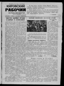 Пролетарии всех стран, соединяйтесь1 КИРОВСКИЙ РАБОЧИЙ Орган Кировского райкома Коммунистической партии Советского Союза и районного Совета депутатов трудящихся Год пзДання XXIII .’б 7!) (3089) j ЧЕТВЕРГ, 1 октября 1953 г. j Цена 10 коп. В нашу эпоху великое учение Маркса—Энгельса — Ленина—Сталина освещает для всего человечества путь развития мировой цивилизации. Наша партия сильна тем, что она руководствуется во всей своей деятельности марксистско-ленинской тео­ рией. Её политика опирается на научное знание зако­ нов общественного развития. Г. М. МАЛЕНКОВ, МОГУЧЕЕ ИДЕЙНОЕ ОРУЖИЕ В БОРЬБЕ ЗА КОММУНИЗМ Сегодня исполняется 15 лет со дня выхода в свет книги «История Всесоюзной Комму­ нистической партии (болыневи ков). Краткий курс»—энцикло­ педии основ марксизма-лени­ низма. Это произведение обобщает гигантский опыт борьбы Ком­ мунистической партии Совет­ ского Союза против всех врагов рабочего класса, борьбы за свержение царизма и капита­ лизма, за установление дикта­ туры пролетариата, за построе­ ние социализма в нашей стране. «Краткий курс»—гениальное произведение творческого марк­ сизма, являющееся могучим идейным оружием в борьбе за коммунизм. Эта книга воспиты­ вает у всех советских людей чувство нового, дает силу ориентировки, заостряет поли­ тическую бдительность, воору­ жает трудящиеся массы реши­ мостью претворить в жизнь идеи марксизма-ленинизма. «Краткий курс истории ВКП(б)» дает стройное, един­ ственно правильное и глубоко научное. Ллкование истории Коммунистической партии Со­ ветского Союза, показывает силу и жизненность передовых идей партии в ее глубокой связи с массами, в ее опоре на все революционное, растущее, развивающееся, в ее непримири­ мой борьбе против всего старо­ го, реакционного. Издавая «Краткий курс исто­ рии ВКП(б)», Центральный Комитет партии исходил из то­ го, что зад, чи правильного ру­ ководства &6®ми отраслями ком­ мунистического строительства требуют от всех руководителей глубокого знания основ марк­ сизма-ленинизма и умения ру­ ководствоваться революционной марксистской теорией в своей практической деятельности. Во всей истории революци­ онной мысли ни одна книга не имела такого успеха и такого широкого распространения, как «Краткий курс истории ВКП(б)». Эта книга переведена на все языки народов мира, издается в миллионах экземпляров; она является настольной книгой каждого коммуниста, каждого борца за дело мира, демокра­ тию и социализм. становке, вселяла уверенность в свои силы и вдохновляла со­ ветских людей на боевые подви­ ги в период Великой Отече­ ственной войны. Она явилась величайшим ис­ точником энергии нашего наро­ да в послевоенные годы в деле восстановления и дальнейшего развития всего народного хо­ зяйства советской державы. «Краткий курс истории ВКП(б)» умножает силы комму­ нистических и рабочих партий всех стран и всех борцов демо­ кратического лагеря в их общей борьбе за мир, укрепляет в них уверенность в том, что ковар­ ные планы империалистов — поджигателей новой войны по­ терпят неминуемый крах, что дело мира, демократии и социа­ лизма восторжествует во всем мире. Исторические решения XIX съезда Коммунистической пар­ тии Советского Союза явились великой программой борьбы и побед, мобилизующей советский народ на строительство комму­ низма, вдохновляющей все пр