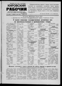 КИРОВСКИЙ РАБОЧИЙ Орган Кировского райкома Коммунистической партии Советского Союза и районного Совета депутатов трудящихся Год издания XXIV Пролетарии всех стран, соединяйтесьI № 27 (К990) ЧЕТВЕРГ, 1 апреля 1954 г. Цена 10 коп. Коммунистическая партия и впредь будет неустанно бороться за дальнейшее улучшение жизни народа, будет твердо и последовательно проводить намеченную ею программу повышения материального благосостоя ния трудящихся. Партия видит в этом свою священную обязанность. (Из Обращения ЦК КПСС ко всем избирателям). В Совете Министров Союза ССР и Центральном Комитете Коммунистической партии Советского Союза О новом снижении государственных розничных цен на продовольственные и промышленные товары Совет Министров Союза ССР и Центральный Коми тет КПСС постановили: 1. Снизить с 1 апреля 1 9 5 4 года государственные розничные цены на продо вольственные и промышлен ные товары в следующих размерах: ХЛЕБ ПЕЧЕНЫЙ, МУКА И МАКАРОНЫ Хлеб ржаной на 8 % Хлеб пшеничный, булки, баранки и другие хл ебобу лочные изделия на 5% Мука ржаная, пше ничная, кукуруз ная и другая мука на 5 °/< Соевая блинная мука на 15 % Макароны, верми шель, лапша и другие макарон ные изделия на 5 % ЗЕРНО И ФУРАЖ Рожь на 8 4 Пшеница, овес, яч мень и другие ви ды зерна, отруби, жмыхи, шроты, комбикорма, сено и солома в сред нем па 5 % БАКАЛЕЙНЫЕ ТОВАРЫ Чай черный бай ховый на 1 0 4 Кофе натуральный, какао, кофейные, чайные и какао- напитки в сред нем на 1 5 % Соль немолотая на 1 0 4 Соль молотая, не фасованная на 2 0 ' f ТКАНИ Батист, маркизет, вольта и другие летние платяные хлопчато - бумаж ные ткани и ме- бельно - декора тивные хлопчато бумажные ткани в среднем па 2 0 4 Новыми у<* • Сегодня утром состоялся митинг технологов ком со мольско-молодежной брига ды № 3 обогатительной фаб рики, посвященный новому снижению государственных розничных цен на продо вольственные и промышлен ные товары. О перечне снижения цен рассказала начальник мель- ничпо - флотационного цеха тов. Нестерова. — Новое, седьмое по сче ту, снижение цен — это яркое Хлопчато - бумаж ные ткани с ис кусственным шел ком Ситец, сатин и дру гие хлопчато-бу мажные ткани в среднем Ш елковые ткани из натурального шелка в среднем Готовая одежда, трикотаж и голов ные уборы , пла тья, блузки и дру гие швейные из делия из хлопча то-бумажных лет них платяных тка ней в среднем Платья, блузки, белье и другие швейные изделия из других хлоп чато-бумажных тканей в среднем Платья, блузки бе лье и другие швейные изделия из тканей нату рального шелка в среднем Трикотажные изде лия в среднем Чулки и носки хлопчато - бумаж ные в среднем Чулки и носки шел ковые и другие в среднем Чулки из волокна капрон в среднем Головные уборы из хлопчато - бумаж ных, шелковых, полушерстяных и грубосуконных тканей Шляпы соломенные ОБУВЬ Обувь кожаная в среднем на 1 0 4 на 1 5% на 1 0 % на 15 4 на 1 0 4 на 7 4 на 8 4 на 2 0 '., па 1 0% на 2 5 ', на 1 0% на 1 0 4 на 7% Обувь текстильная и комбинирован ная в среднем на 2 0 % Галоши, боты , са поги и другая ре- . зиновая обувь в среднем на 12 % ГАЛАНТЕРЕЙНЫЕ ТОВАРЫ Галантерея тек стильная в сред нем на 1 0 % Нитки и ниточные изделия в сред нем на 1 5% Абажуры в среднем на 1 0% Вата и ватин на 15 4 Иглы швейные ма шинные, ручные и другие на 2 0 % Ювелирные изде лия в среднем на 1 0% МЫЛО И ПАРФЮМЕРНО- КОСМЕТИЧЕСКИЕ ТОВАРЫ Мыло хозяйствен ное в среднем на 15 4 Мыло туалетное в среднем на 2 0 4 Д