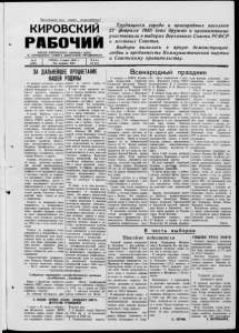 Пролетарии всех стран, соединяйтесь! КИРОВСКИЙ РАБОЧИЙ ОРГАН КИРОВСКОГО ГОРКОМА КПСС И ГОРОДСКОГО СОВЕТА ДЕПУТАТОВ ТРУДЯЩИХСЯ №26 (4094) СРЕДА, 2 марта 1955 г. Год издания XXV Ц е н а 15 коп. Трудящиеся города и пригородных поселков 27 февраля 1955 года дружно и организованно участвовали в выборах Верховного Совета РСФСР и местных Советов. Выборы вылились в яркую демонстрацию любви и преданности Коммунистической партии и Советскому правительству. ЗА ДАЛЬНЕЙШЕЕ ПРОЦВЕТАНИЕ НАШЕЙ РОДИНЫ 27 февраля состоялись выборы в Верховный орган власти Рос сийской Федерации и в местные Советы депутатов трудящихся. День выборов превратился в мощную демонстрацию советского патриотизма, морально-политиче ского единства советских людей, их готовности трудиться еще упорнее на благо своей Родины. В городе Кировске, как и в других городах и населенных пунктах РСФСР, выборы прошли организованно и дружно. В пер вой половине дня проголосовало подавляющее большинство изби рателей. Уже к 11 часам полно стью закончили голосование тру женики первой и третьей ферм подсобного хозяйства «Индуст рия», лесозаготовители участков Уполокша Зашейковского лесо комбината и Детково-Ламбино Ламбинского леспромхоза, жители станции Питкуль и другие. Горняки, обогатители, строите ли города, работники предприя тий местной промышленности, колхозники, рабочие подсобных хозяйств и все трудящиеся города и поселков, голосуя за кандида тов нерушимого блока коммуни стов и беспартийных, вместе со всеми трудящимися республики демонстрировали в этот день свою сплоченность вокруг Коммунисти ческой партии Советского Союза, ведущей нашу страну по пути к коммунизму. Голосуя за кандидатов блока коммунистов и беспартийных, труженики выражали свое стрем ление множить трудовые успехи на благо социалистического оте чества, свою готовность досрочно выполнить производственные пла ны 1955 года и план пятой пяти летки. Голосуя за кандидатов блока коммунистов и беспартийных, из биратели изъявляли свою непре клонную волю до конца отстаи вать дело мира, трудовыми успе хами крепить оборонную мощь Советского государства. Такие наказы избиратели дали и своим кандидатам. Семидесятилетняя избиратель ница Федорова Евдокия Федоров на, опуская бюллетени, сказала: — Пусть работают наши кан дидаты на счастье народа, на укрепление мира. В этих словах выражены мы сли и чувства миллионов трудя щихся нашей страны. Советские люди знают, что их избранники— достойные предста вители народа. Это передовики промышленных предприятий и сельского хозяйства, лучшие учи теля и врачи, инженеры и тех ники, партийные и советские ра ботники. Они упорно, самоотвер женно, как и прежде, будут бо роться за претворение в жизнь исторических решений январ ского Пленума ЦК КПСС и второй сессии Верховного Совета СССР и других важнейших по становлений партии и правитель ства, направленных на дальней ший подъем тяжелой промышлен ности и на ее основе— легкой промышленности и всех отраслей сельского хозяйства. Выполняя наказы избирателей, они будут настойчиво добиваться увеличе ния в стране продуктов живот новодства и товаров массового потребления, будут способствовать подъему материального благо состояния трудящихся, повыше- | нию их культуры и здорового I быта. ! В городе и во всех поселках выборы прошли на высоком орга низа