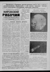 Распределение oobei.'? ов на невидимой с Земли стороне Луны, выявленных при предварительной обработке фотогра­ фии, полученных с борта автоматической межпланетной стан­ ции: 1. Большое кратерное море диаметром 300 км—море Москвы; 2. Залив Астронавтов в море Москвы; 3. Продолже­ ние Южного моря на обратной стороне Луны; 4. Кратер с центральной горкой Циолковский; 5. Кратер с центральной горкой Ломоносов; 6. Кратер Жолио-Кюри; 7. Горный хребет Советский; 8. Море Мечты. Сплошная линия, пересекающая схему,— лунный экватор; пунктирная линия— граница види­ мой и невидимой с Земля частей Луны. Римскими цифрами обозначены объекты видимой части Луны; I —море Гумбольд­ та; I I —море Кризисов; Ш море Краевое; I V —море Волн: V —море Смита; V I—море Плодородия; V I I—море Южное. ТРЕТЬЯ СЕССИЯ ВЕРХОВНОГО 29 октября на утренних и ве­ черних раздельных заседаниях па­ лат третьей сессии Верховного Совета СССР продолжалось обсуж­ дение плана развития народного .хозяйства и Государственного бюджета на I960 год. 30 октября на утреннем засе­ дании Совета Национальностей за­ кончилось обсуждение плана раз­ вития народного хозяйства и Го­ сударственного бюджета СССР на 1960 год. В Совете Союза обсуж­ дение проектов плана и бюджета страны на 1960 год было закон­ чено накануне. Всего в прениях выступил 81 человек. На заседании Совета Союза, а затем на заседании Совета На­ циональностей с заключительным словом выступил заместитель Председателя Совета Министров СССР, Председатель Госплана СССР депутат А. Н. Косыгин. Он подчеркнул, что представ­ ленный правительством на ут­ верждение Верховного Совета план развития народного хозяйства на 1960 год в результате всесторон­ него рассмотрения встретил пол­ ное одобрение выступавших депу­ татов. На раздельных заседаниях па­ лат депутаты единогласно приня­ ли Закон о Государственном пла­ не развития народного хозяйства СССР на 1960 год. После заключительного слова заместителя Министра финансов СССР В. Ф. Гарбузова Совет Сою­ за и Совет Национальностей на раздельных заседаниях единоглас­ но приняли Закон о Государствен­ ном бюджете Союза Советских Со­ циалистических Республик на Положение автоматической межпланетной станции в про­ странстве при фотографировании обратной стороны Луны (стрелки справа показывают направление лучей Солнца). (Фотохроника ТАСС). СОВЕТА СССР 1960 год. Бюджет по доходам ут­ вержден в сумме 772 миллиарда 990 миллионов 487 тысяч рублей и по расходам в сумме 745 мил­ лиардов 808 миллионов 593 ты­ сячи рублей Принимается также постановление об утверждении от­ чета об исполнении Государствен­ ного бюджета СССР за 1958 год. После короткого перерыва в Большом Кремлевском дворце со­ стоялось совместное заседание Совета Союза и Совета Нацио­ нальностей. Сессия переходит к обсуждению третьего вопроса по­ вестки дня. С докладом о проек­ те Закона о бюджетных правах Союза ССР и союзных республик выступил Председатель Комиссии законодательных предположений Совета Национальностей депутат Д. Расулов. (Окончание на 2-й стр.). Почти всю первую половину октября коллектив деревообде­ лочного цеха комбината произ­ водственных предприятий тре­ ста «Апатитстрой» работал без особого напряжения. Причиной был недостаток лесоматериалов. Тяжесть выполнения плана лег­ ла в основном на вторую поло­ вину месяца. Обязательство дерево