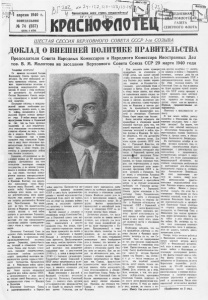 г«* •/1 • г:ог.й! ~ Т 5 s 4 апреля 1940 г. понедельник № 74 (557) ЦЕНА 5 КОП. h г 2 . . 0 2 - ? ‘/ ' 1 г 7 , ! г з - 1 Г 7 ? 1 3 - 1 / • У ' Ц Пролетарии всег стран, соединяйтесь? СЕВЕРНОГО ФЛОТА ШЕСТАЯ СЕССИЯ_ ВЕРХОВНОГО СОВЕТА СССР Его СОЗЫВА ДОКЛАД О ВНЕШНЕЙ ПОЛИТИКЕ ПРАВИТЕЛЬСТВА Председателя Совета Народных Комиссаров и Народного Комиссара Иностранных Дел тов. В. М. Молотова на заседании Верховного Совета Союза ССР 29 марта 1940 года Товарищи депутаты! Со времени последней Сессии Верховного Совета прошло пять месяцев. За этот небольшой пе риод произошли события, имею щие первостепенное значение в развитии международных отно шений. В связи с этим необходи мо рассмотреть на настоящей Сессии Верховного Совета вопро сы, относящиеся к нашей внеш ней политике. Последние события в междуна родной жизни необходимо рас сматривать, прежде всего, е све те войны, начавшейся в Цент ральной Европе осенью прошло го года . В войне между англо- французекдм блоком и Германией до сих пор не было крупных сражений, л дело ограничива лось отдельными столкновениями, главным Образом на море, а так же в воздухе. Известно, однако, что выраженное еще в конце прошлого года стремление Герма нии к .миру было отклонено пра вительствами Англии и Франции, ввиду чего, с обеих сторон, под готовка к развертыванию .войны еще больше усалилась. Германия, об’единившая за по следний период до 80 миллионов немцев, поставившая иод свое господство некоторые соседние государства, и во многом усилив шаяся в военном отношении, ста ла, как видно, опасным конку рентом главных империалистиче ских держав в Европе—Англии и Франции. Поэтому, под предло гом выполнения своих обяза тельств перед Польшей, сии об’- явили войну Германии. Теперь особенно ясно видно, как дале ки действительные цели прави тельств этих держав от интере сов защиты .распавшейся Польши или Чехо-Словакпи. Это видно уже из того, что правительства Англии и Франции провозгласили своими целями в этой войне разгром и расчленение Германии, хотя эти цели Перед народными массами все еще прикрываются лозунгами защиты «демократиче ских» стран и «прав» малых на родов. Поскольку Советский Союз не захотел стать пособником Англии и Франции в проведении этой империалистической политики против Германии, враждебность их позиций в отношении Совет ского Союза еще 'больше усили лась, наглядно свидетельствуя, насколько глубоки классовые корни враждебной политики им периалистов против социалистиче ского государства. Начавшуюся же. в Финляндии войну англо- французские империалисты гото вы были сделать отправным пунктом для войны против ССОР, е использованием в этих- целях ®е только самой Финляндии, но и скандинавских стран — Швеции я Норвегия. Отношение Советского Союза к развертывающейся в Европе •х&<%*Х;Х\£Х£ХхХ£х>х<*х ж y^?X'X*XvX4vX\*t*XyX*XxX’ ,X*X,XvX,X*XvX>X’%>*X*X>»' ФХ\,Х,Х,Х*Х,.,.*.х«>ХФ&| войне известно. Проникнутая ми ролюбием внешняя политика 'ССОР и здесь была продемонстри рована с полной определенностью. Советский Союз сразу же заявил, что он стоит на позиции нейтра литета и- неуклонно проводил эту- политику в течение всего ис текшего периода. Крутой поворот к лучшему в отношениях между Советским Сою зом и Германией нашел свое вы ражение в договоре о ненападе нии, подписанном в августе прошлого года. Эти новые, хоро шие советско -германские отноше ния были проверены на оп