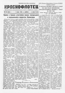 Пролетарии всех стран, соединяйтесь! ежедневная краснофлотская газета северного флота JM5 123 (Б06) цена 5 коп. Прием в Кремле участников показа театрального и музыкального искусства Ленинграда 29 мая вечером в Кремле со­ стоялся Прием участников показа театрального и музыкального искусства Ленинграда, устроен­ ным Комитетом по делам иожуест® при Совнаркоме С-СОР. В Георгиевском зале Большого Кремлевского дворца собрались гости. Здесь присутствуют чле­ ны ЦК ВКП(б), депутаты Вер­ ховного Совета ССОР и Верхов­ ною Совета РСФСР, Народные Комяс'слры, Герои Советского Союза, виднейшие мастера искусств, писатели, ученые. Среди присутствующих — тт. Тимошенко, Кулик, Шапошников, Вышинский, Димитров, Щербаков, Ярославский, Поскребышев, Воз- иесен’ский, Первухин, Косыгин, Кузнецов, Горкин, Пойпелов, Ло­ зовский, Ванников, Шахурин, Мальшпев, Лихачев, Кафтанов, Гипябурт, Большаков, Герои Со­ ветского Союза Кравченко, Смуш- •кевич, Громов, Беляков, Спирин, Молоков, Шмидт, Кренкель, Шир., шов, Данилин, Осипенко, Алек­ сеев, Гризодубова, Доронин, На­ родные артисты СССР Немиро­ вич-Данченко, Корчагина-Алек- с андровская, Мотгурина.-Самойло- ва, Юрьев, Барсова, Самосуд и др. Появление в зале товарищей Сталина, Молотова, Ворошилова-, Кагановича, Андреева, Жданова, Шверника, Маленкова, встречает­ ся бурной овацией. В течение нескольких минут присутству­ ющие приБея'ствуют товарища Стадина и его соратников. Краткое вступительное слово произносит председатель Комите­ та по делам искусств при Сов­ наркоме ССОР тов. М. Б. Храоттенке. — Мы собрались сегодня в Кремлевском дворце, — говорит тов. Хранченко, —е в честь по­ каза в Москве театрального и музыкального искусства Ленин­ града. Мастера искусств города Ленина демонстрировали в сто­ лице Советского Союза свое вы­ дающееся мастерство, высокую театральную и музыкальную культуру. В показе участвовали .старейшие русские театры — театр драмы им. Пушкина, и театр оперы и балета им. Кирова, целый ряд молодых коллективов, выросших после Великой Ок­ тябрьской социалистической ре­ волюции. Бережно сохраняя культурные ценности прошлого, ■город Ленина оседал замечатель­ ное новое искусство. За годы со­ ветской власти в Ленинграде вы­ росли многочисленные кадры поистине великолепных мастеров искусств, которыми ГОРДИТСЯ'ВСЯ советская страна. Искусство н культура Ленинграда, как и всей нашей страны, обязаны своим расцветом неустанным заботам вашей коммунистической партии - . тов- ъаФР°Н0В» — составлен в ^ g безгоамотпостью пало пепге- ж правительства, заботам вождя g 4€pa в Денинакан -прибыл Пред-. стр,(№'н вводный почетный ьа- полном соответствии с народно- тель1ТО покончить как с аитаго- чрудящюхея товарища Сталина, „ ___ „ раул от частей Денинажанского хозяйственным планом латпей пе? „ ’ - п т » седатель Президиума Верховного шипом нашей p e t. сударствепиой и антиболыпевист- Язы товарища Сталина иьгзы- л . . . . гарнизона. ; публики. Доходная часть бюджета ~~~*______ Славной и непобедимой Красной■триотов, обращенное к непобеди- Армии, .которая разгромила бело- мой Красной Армии и первому, финнов, 'пытавшихся посягнуть Маршалу Советского Союза Кля., на советские рубежи и нарушить меиту Ефремовичу Ворошилову. 'безопасность города Ленина. Все Присутствующие с исключитель­ ным под’е-мом приветствуют ге- 'роичесКую Красную Армию
