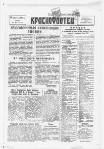 августа 1945 г. среда 193 (2270) БЕЗОГОВОРОЧНАЯ КАПИТУЛЯЦИЯ ЯПОНИИ 14 августа Правительство Соединенных Штатов получило через Швейцарское Пра вительство следующее сообщение от Япон ского Правительства: «По вопросу о ноте Японского Прави тельства от 10 августа относительно при нятия условий Потсдамской Декларации и ответа Правительств Соединенных Шта тов, Великобритании, Советского Союза и Китая, посланного государственным се кретарем Америки Бирнсом и датирован ного 11 августа, Японское Правительство имеет честь сообщить Правительствам че тырех держав следующее: «1. Его Велшество Император издал Императорский рескрипт о принятии Япо нией условий Потсдамской Декларации. 2. Его Величество Император готов санкционировать и обеспечить подписание его Правительством и Императорской Ге неральной штаб-квартирой необходимых условий для выполнения положений Пот сдамской Декларации. Его Величество также готово дать от себя приказы всем военным, военно-морским м авиационным властям Японии и всем находящимся в их подчинении вооруженным силам, где бы они ни находились, прекратить боевые дей ствия и сдать оружие, а также дать такие другие приказы, которые может потребо вать Верховный Командующий Союзных Вооруженных Сил в целях осуществления вышеуказанных условий». П Р N И * 8 командующего Семрныи флотом 0 награждения личного состава Северного флота о рд е н ам н медалям Союза ССР 1 августа 194В е. М 58 От имеяи Президиума Верховагмч) Совета Союза ССР за образ цовое выполнение боевых гаданий К»м*ид»вачяя на фрэчт* борьбы с немецкими захватчиками и проявленные при этой доблесть и му* жество награждаю: 29. Огарпшну 1 статьи Ночега- К ва Аркадия Андреевича, .питана Кудлаева Петра Михайловича. 0РДЕН0 ОТЕЧЕСТВЕНН 1-й СТ ОМ я „ в ОЙНЫ ОТ СОВЕТСКОГО ИНФОРМБЮРО Оперативная сводка за 14 августа В течение 14 августа на Дальнем Востоке советские войска продолжали развивать наступ ление. Войска 1-го ДАЛЬНЕВОСТОЧНОГО фронта, наступая вдоль железной дороги ПОГРАНИЧ НАЯ — ХАРБИН, форсировали реку МУ- ДАНЬЦЗЯН и после упорного боя овладели го родом и крупным железнодорожным узлом МУДАНЬЦЗЯН, а также заняли населенные пункты САНЬДАОГАН, БЭЙТЯНЬЦЗЫ, ЧЭНЦ- ЗЫ, ШИЧЖАНСИГ0У. Войска 2-го ДАЛЬНЕВОСТОЧНОГО фронта, наступая по обоим берегам рени СУНГАРИ, продвинулись вперед на 40 — 50 нилометров и с боем заняли город и железнодорожную стан цию СИНШАНЬЧЖЭНЬ и населенные пункты ЦЗИСЯНЬЧЖЭНЬ, ФАНБАОЧЖЭНЬ, ВОФУ- ГАН. На острове САХАЛИН войска фронта про рвали приграничную оборонительную полосу противника и продвинулись на юг на 15 — 20 нилометров. Войска ЗАБАЙКАЛЬСКОГО фронта, разви вая наступление к востоку от БОЛЬШОГО ХИНГАНА, с боем овладели городом и круп ной железнодорожной станцией ТАОНАНЬ, а также заняли города ЛИНЬСИ, ДАБАНЬШАН, ЛУБЭЙ, ЧЖАНЬЮЙ, ТУЦЮАНЬ, ГЭГЭНЬМЯО, продвинувшись за день на 100 — 150 кило метров. Корабли и части Тихоокеанского флота с боем овладели корейским портом СЕЙСИН. За время с 9 по 13 августа наши войска на Дальнем Востоке взяли в плен более 8.000 сол дат и офицеров противника. Наша авиация наносила удары по желез нодорожным узлам в Маньчжурии и японским портам в Северной Корее. СОВИНФОРМБЮРО. (Принято по радио). Обед у Председателя Совета Народных Комиссаров ССОР N. В. Сталина в честь генерала армии Дуайт Д. Эйзенхауэра 13 августа Председатель Со вета Народн