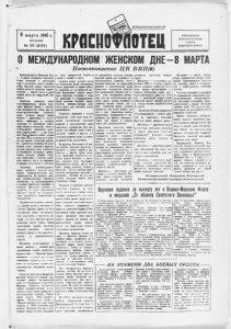 6 марта 1945 г. вторник № 65 (2132) к г а с и о НЕМЕЦКИМ ОККУПАНТАМ! ЕЖЕДНЕВНАЯ КРАСНОФЛОТСКАЯ ГАЗЕТА СЕВЕРНОГО ФЛОТА О МЕЖДУНАРОДНОМ ЖЕНСКОМ ДНЕ- 8 МАРТА Постановление Ц К ВКП (4 ) леждународошй Ж дастий День — 8 марта женщины Саветокадо Союза отмечают в настоящем году в обстаи(Уикс новых великих побед Красной Армии. Советские войта изгнали немецких порабо тителей с нашей земли и ныне громят врага на территории Гер мании. Сойотские женщины *жоим еамоочйерясенным трудом помо кнет Красной Арммг в даЬоева- ияи исторических побед над не- иещкю-фашисттиаш захватчи ками. Сла/вные дочери нашей Родины — работницы и колхоз ницы, инженеры и техники, агрономы и зоотехники, работ ники науки и исасуюотва. врачи и учительницы, работницы совет ских учреждений — в дайВели кой Отечественной войны отдают вое свои силы и знания делу побе ды над врагом. Советские женщи ны, заменивна производстве овоих мужей, ОТЦО.В. сыиюней и братьев, да деле доказали свою готовность и сягоюобетость овладевать профес сиями, которые иада/виа счита- хись мужскими, и ВЫНОСЯТ основ ную тяжесть труда на фабриках и заводах, в юолхоеах и совхозах. Советские жеищины-работ- пицы являются толикой СИЛОЙ нашей оощиалиетмчоокой про мышленности, На военных заво- дая, электростанциях, нефтяных промьйслах, на железнод<ф«жиам л речном транспорте женщины и девушки проявляют доблесть и геройство в труде, обеспечивая Краевую Армию все возрастаю щим количеством вооружения и Сюенрипа^о®. Якшщпны-кодховяицы являют ся главной силой в сельском хо зяйстве. Красная Армия на вгем протяжении воины по испыты вает недостатка в продуктах пи тания и в этом огромная заслуга щ ф колхозниц нашей страны. Овои'н героическим трудом миллионы женщин -колхозниц помотают гнабжать фронт и тыл продоволь ствием, а иромьшилсяность сырьем. Женщины освобожденных от ijpara районов с каждым днем ■увеличивают помощь своей осво- бодител[.ииле — К/рашой Армии, бевзатегно трудятся над восста- !н«Влением городов и сел, хозяй ства и культурных учреждений, разрушенных немецкими захват чиками. Советские женщины-матери вы метили доблестных воинов, про шедших боевой исторический путь от Сталинфада к подступам Берлина. Советское государство слагвит женщин-.матерей, воспи тавших своих сын<<в храбрыми л бесстрашными воинами. Учреж дение звания "Мать-геройня», ордена «Материнская слава» и «(Медали материнства» еще вышп подняло в СССР почетную роль •матери. Женщины-матери воспи тывают пудрастающее поколение в духе преданности Родине и любви к знанию и труду. Десятки тысяч женщин веяли на воспитание детей, потерявших евоих родителей во время войны, и окружили их материнской лас кой. Неоценимую помощь оказы вает советская женщина в уходе за ранеными и выздоравливаю щими воинами КраЮной Армии. Тысячи женщин-доноров дают евюю кровь для опасения жизни Фронтовиков. Советские женщины с честью ■выполняют свой долг перед Ро диной, способствуют усилению военной и экономической мощи со'ветсяього государства. Они ока зались достойными своих отцов л сыновей, мужей и братки, от стоявших родную землю от немец ко-фашистских захватчиков. На фронтах Отечественной вой ны многие советские женщины с оружием в руках геройски сра жаются с врагом. Среди связи стов, снайперов, зенитчиков, лет чиков немало женщин — масте ров военного дела. Санитарки, меди