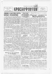 •г З а н аш у Советскую 1 ^.о< 5 октября 1945 г. п я т н и ц а № 237 ( 2314 ) ЕЖЕДНЕВНАЯ КРАСНОФЛОТСКАЯ ГАЗЕТА СЕВЕРНОГО ФЛОТА ЛЮБОВНОИЗАБОТЛИВОРАСТИТЬ МОЛОДЫХ КРАСНОФЛОТЦЕВ У каждого моряка на всю жизнь запечатлевается в памяти Tfttдень, когда он впервые всту пил в дружную семью краено- флохцев. И этот день подчас ре шает очень многое. Он является как бы прологом к будущему мо лодого моряка, определяет его да. 1 ьиеншую службу. Вот потому- то старшины и старослужащие краснофлотцы с первого же дня прихода в часть, на корабль первогодков должны окружить их заботой и одновременно создать твердый режим жизни, чтобы не.лодые краснофлотцы в первые же часы, проведенные среди мо ряков, почувствовали крепкую воинскую организацию и дисцип лину. Ни в коем случав нельзя оття гивать начало занятий с молоды ми по специальности. Интересы дела требуют, чтобы на второй же день службы молодые красно флотцы приступили к изучению боевой техники, уетавов, настав лений и порядков, существую щих на флоте. Воспитание перво годков должно быть поставлено так, чтобы оно всемерно еодей- флотцы Козко, Гущин и многие другие. В результате правильной организации учебы и повседнев ной помощи молодым красно флотцам, они за короткое время стали неплохими специалистами. Краснофлотец Козин изучил си луэты самолетов, дальномер и другие приборы. Краснофлотец Иванов овладел сложной радио аппаратурой и уже несет само стоятельную вахту. Дробин стал умелым артиллеристом-зенитчи- ком . Молодые краснофлотцы не только освоили специальности. Они научились также без отступ лений выполнять воинские уста вы, бороться за твердый порядок в подразделении. Ни один из них не имеет дисциплинарных взы сканий. Это позволяет сказать, что в подразделении офицера Фидяева сумели правильно орга низовать воспитание молодых, нашли к ним верный подход. Совсем по-другому обстоит дело в подразделении лейтенанта Ермакова. Здесь слаба требова тельность к молодым со стороны елвовало формированию в моло- 1младших командиров, етароелу- де.м моряке необходимых воин ских качеств. Факты показывают, что там, где молодым создают необходи мые условии для учебы, где серьезно насаждают воинскую дисциплину — там первогодки в короткие сроки становятся хоро шими специалистами, растороп ными, дисциплинированными мо- рлками. В подразделении офицера Фи- д;;ева новичков встретили радуш но и гостеприимно, как встре чают только в родной еемье. Ста рослужащие заботливо стали учить новичков специальности, прививать им необходимые для бойца-зенитчпка навыки. Большое старание в этом деле проявили сержант Елесив, млад ший сержант Танышев, красно- жащпе краснофлотцы почти не участвуют в воспитании н обуче нии новичков специальности. Хуже того, молодые с первых же дней пребывания в подразделе нии занимаются но специаль ности вместе со старослужащими. Понятно, что такие занятия мало дают пользы новичкам, к тому же, они проводятся от случая к слу чаю. О дополнительных вечерних занятиях и помощи отстающим и говорить не приходится. Их нег и в помине. Такое отноше ние к обучению и воспитанию молодых краснофлотцев кроме вреда ничего не приносит. Любовно и заботливо растить и обучать молодые кадры воен ных моряков-североморцев — благородная и почетная задача. Решить эту задачу мы должны хорошо. 150-летие со дня рождения К. Ф. Рылеева Тор