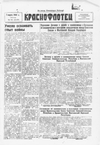 За нашу Советскую Родину? 1 марта 1946 г. пятница № 5 0 ( 2 4 3 6 ) К Г Й С Н О и ЕЖЕДНЕВНАЯ КРАСНОФЛОТСКАЯ ГАЗЕТА СЕВЕРНОГО ФЛОТА Умело осваивать пыт войны спе- пнальности, рассказывают о бое вых эпизодах. строят занятия на ярквх примерах из опыта войны. :<то, несомненно, повышает каче ство боевой подготовки, делает ее более содержательной. Большой и серьезной школой |обучая своих подчиненных для военных моряков, .как к для ц ех вооруженных сил советской гчраны, была Великая Отечест венная война против немецко- фашистских захватчиков. 'Веянная Отечественная вой на, — указывает товарищ Сталин в приказе № 8 , — внесла в воен ное депо иного нового. Боевой опыт, добытый на полях сраже ний. представляет богатую сокро вищницу для обучения м воспита ния войск. Поэтому всю подготов ку армии надо проводить на осно ве умелого освоения опыта ми- 11 ) вшей войны». Но освоение боевого опыта 01 е- чественной войны на кораблях и в частях нашего флота пока еще носит бессистемный характер. Основным недостатком в этом важном деле является то. что опыт войны изучается некон кретно в нецелеустремленно. Ес-< принимали участие Заместитель Премьер-Министра МНР Цеден.‘ бап и Посланник МНР е Москве Самбу. Подписание Догов ра о дружбе и взаимопомощи иСоглашения обэкономическомикультурном сотрудничестве междуСоветским Союзом и Монгольской Народной Республиной В период с 21 по 27 февраля в Москве происходили перегово ры между Председателем Со вета Народных Комиссаров СССР И. В. Сталиным и Народ ным Комиссаром Иностранных Переговоры закончились под писанием 27 (февраля Договора о дружбе и взаимопомощи меж ду Союзом Ооветских Социали стических Республик и .Мои. гольской Народной Ро'епуОл 15 - Дел СССР В. М. Молстовь1М. с |кой. Одновременно с этим было одной стороны, н Премьер-Ми- ; подписано Сот • шевио об эко. нистром Монгольской Народной Республики маршалом Чойбэл- саном, г другой стороны. С советской стороны в пере говорах принимали участие За меститель Народного Комиссара Иностранных Дел СССР С. А- Лозовсний и Посланник ССОР в МНР И. А. Иванов. Г монголь- ской стогны в 'пер^‘Г<гво})вх ли, например, командир кораб ля ставит задач?: изучить с лич ным составом боевой опыт по от ражению воздушных атак против- Надводные и подводные кораб- ни®3» то дТУ задачу необходимо та, мпрская авиация, береговая днференцировать. С зеннтчнкамв артиллерия, морская иехота — на*° ИЗУчать опыт стрельбы по рода оружия Северного флота, вражеским самолетам, с сигналь- идошедшие сквозь огонь сражений, лайками опыт наблюдения за приобрели богатый боевой опыт, воздухом, с котельными маши- Бсдь в годы войны каждый нистами обеспечение нужных иглод, каждая боевая операция, *°Д°® и маневра во время боя и м.ьждый бой вносили что-то новое Пг ДРУГИМИсловами надо учить в военное дело, обогащали знания краснофлотцев именно тому, что от них требуется по и специаль ности. Такое освоение опыта вой ны принесет реальные результаты в боевой подготовке лжчного ~со става. БОМИЧвСК-СШ 34 Ь‘уЛЬТур]К»М СО- трудничостве. Д оговор и Соглашение «были ПОДПИСАНЫ с сот-етсяеб стороны Замоететалем Председатоля Совнаркоме в Народным Комис- саром Иностранных Дел ССОР В. М. Мслотовым, с ‘монгольской стороны — Лромьср-Министром МНР — Чойбалс&ьсм. Кроме того, с ооветсасой сто- тг-ль Народного Комиссара Ино странных Дел СССР С. А. Ло- зоьский,