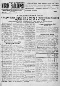 Аролдтврии t?е»я стран, с&еЬивяОтесЫ вРГАН УПРАВЛЕНИЯ МУРМАНСКОГО ПАРОХОДСТВА И РАЙОННОГО КОМИТЕТА ПРОФСОЮЗА РАБО ЧИХ МОРСКОГО ТРАНСПОРТА Год и заа ни я XII „Всякий шаг полнощи, которая оказывается Присной армии в тыму, сей.ас те сказывается на настроена j красноармейцев,,. Всякая помощь, оказанная в тыл/ красноармейцам, немедленно превращается в усиле ние Красной армии , в укрепление им настроения... и 'в увеличение нас тупательной способности^ , ЛЕНИН. № 9, (1 1 2 9 ). ЧетЕерг, 3 і^еграля 1944 г. Цена 15 нсп: X сессия Верховного Совета СССР 1-го созыва О ГОСУДАРСТВЕННОМ ШДЖЕ1Е СССР НА 1944 ГОД И ГСПШЕЙНК Г С С Щ Ш В Ш Г О БЮДЖЕТА CGC/ ЗА 1941), 1941 и 1942 ГОДЫ Доклад Народного Комиссара Финансов Союза ССР т. А. Г. Зверева на совместном заседании Совета Союза и Совета Национальностей 28 января 1944 года Государственный бюджет СССР Товарищи депутаты! Свыше двух с половиной лет народы нашей ве ликой родины напрягают все силы для того, чтобы разгромить немец ко-фашистских захватчиков. Героическая Красная Армия, ру ководимая гениальным полковод цем Маршалом Советского Союза товарищем Сталиным, с исключи тельным мужеством и силой нано сит сокрушительные удары по не мецко-фашистским оккупантам, го нит их все дальше и дальше на з д, с каждым днем приближая і .ічательную победу над врагом. Успехи Красной Армии неразрыв но свяганы с самоотверженной рабо той миллионов советских людей на фабриках, заводах, в шахтах и руд никах, на транспорте, в сельском хозяйстве, в государственных уч реждениях. Наша мощная индустрия, созданная в годы сталинских пяти леток, явилась материально-техниче ской базой боевых успехов Красной Армии, Расширяя и укрепляя воеи- ; яое хозяйство, советский народ од- I повременно проводит большую раоо- гу по ликвидации последствий не- ! мецкого хозяйничания в районах, I освобожденных от оккупации. ! Народам нашей страны предстоят еще жестокие битвы с ненавистным врагом. От трудящихся Советского I Союза требуется еще большее пал- ряжение сил, мобилизация всех ре- ’ сѵрсов государства для полного , обеспечения потребностей фронта. : Советский народ и его доблестная Красная Армия, вдохновленные ге нием великого Сталина, с честыо выполнят свой долг перед родиной, обеспечат полный разгром гитлеров ских захватчиков. Государственный бюджет 1914 го да, представленный Советом Народ ных Комиссаров Союза ССР на ва ше рассмотрение и утверждение, отражает непоколебимую волю со ветского народа к победе над вра гом. Государственный бюджет СССР за 1940, 1941 и 1942 годы Под’ем народного хозяйства Со ветского Союза в годы мирного строительства являлся основой зна чительного роста государственного бюджета. За 1940 год государствен ный бюджет СССР выполнен по до там в сумме. 180,2 миллиарда руб лей, а по расходам — 174,3 мил лиарда рублей. По сравнению с предшествующим годом доходы бюджета увеличились на 24,2 мил лиарда рублей или на 15,5 про цента. . Государственный бюджет СССР на 194! год, утвержденный V III сес сией Верховного Совета СССР по доходам в сумме 216,8 миллиарда рѵолей и по расходам — 210 мил лиардов рублей, обеспечивал даль нейший рост производительных сил страны и развитие культуры совет ского народа, исходя из обстановки мирного времени. Нападение в середине 1941 года фашистской Германии на Советский -боюз потребовало коренной перест ройки нашего народного хозяйства на военный ла