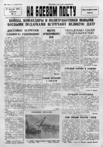 Из части ие выносить. Пролетарии всех стран, соединяйтесь! 17 фе суббота № 4 Г, H O G D E S D M П О С Т И Краснофлотская газета бойцы , командиры и политработники новыми БОЕВЫМИ ПОДАРКАМИ ВСТРЕЧАЮТ ВЕЛИКУЮ ДАТУ достойно ВСТРЕТИМ сла вную годовщину 23 февраля вся страна, весь советский народ будет отмечать славную XXII годовщину Рабоче- Крестьянской Красной Армии и Военно-Морского Красного Флота. День Красной Армии и Воен­ но-Морского Флота — это празд­ ник всего ,народа нашей родины, праздник трудящихся всего мира, ибо наша армия и флот проник­ нуты иптеркандоналнзмом. Наша арЧ'Тя и флот выкованные Лениным, Сталиным, партией оол ьш е вим в и являются верным оплотом социалистического госу­ дарства. Краснофлотцы, командиры и политработники с огромным под’е- мом, умножающим силу и мощь советского оружия, готовятся к своей славной XXII годовщине. Под ’ем политической активности выражается в развертывании со­ циалистического соревнования, за дальнейшее изучение боевой тех­ ники, за укрепление воинской дисциплины и развитие красно­ флотской художественной само­ деятельности. Каждый день приносит вести об отличном несении службы и упорной большевистской работе но совершенствованию своих знаний бойцами, командирами, политра­ ботниками кораблей и частей. Личный состав корабля, где командир т. Егоров находясь про­ должительное время в море пока­ зал мужество и высокую бдитель­ ность по выполнению боевого за­ дания. Механизмы корабля рабо­ тали безотказно. Краснофлотцы Н-ского подраз­ деления 'гг. Соколов, Тюков, Тре­ пелов и др. отлично выполнили огневую задачу, показав этим свое умение и готовность уничто­ жать врага. На ІІ-ском корабле комсомолец командир отделения рулевых т. Смирнов отлично знает свою спе­ циальность и этому учит своих бойцов. Машинисты корабля, где воен­ комом т. Сколотий, тт. Соловьев и Златоустов успешно проводят ремонт механизмов своего об’ек- та. Краснофлотцы и младшие командиры тт. Понов, Белоусов и Пробочкия с активной помощью жен командного состава успешно готовят к выступлению драмати­ ческий, хоровой II музыкальный кружки краснофлотской художест­ венной самодеятельности. Вес эти • успехи достигнуты упорной работой в изучении бое­ вой техники, строгим соблюде­ нием уставов и честным самоот­ верженным трудом на своем по­ сту. Размиие социалистического со- Ггеннотания. движение отличнико® тесно связаны г дальнейшим ук­ реплением боевой мощи наших кораблей іг частей. Главная зада­ ча tor нкомов. партийных и ком­ сомольских организаций состоит', в том, чтобы руководить II уси­ ливать это движение. Надо умело направить социалистическое со­ ревнование таким образом, чтобы каждый боролся за выполнение плана боевой подготовки на 194U год. за новые успехи в ук- і репленни боевой мощи флота. ! Славная ХХП годовщина РККА J и Военно-Морского Флота совна- , дает с XX годовощиной освобож- ! деігия ’Севера от английских ян- І тервентов и белогвардейщины. В ! истории этой борьбы немало на- і писано страниц о славных делах 1 революционных моряков и добле- , стиых воинов Красной Армии на і голову разбивших врагов молодой советской страны. Заклятые враги социализма английские, французские импе­ риалисты и финские белобандиты снова пытаются посягнуть тіа неприкосновенность границ па­ шей родины, на счастливую и радостную жизнь советск