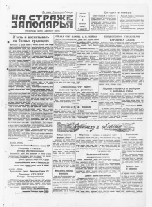 За нашу Советскую РодинуI С е г о д н я в номере : С Т Р А Ж ПОЛЯРЬ Ежедневная газета Северного флота Рапорты товарищу И. В. Сталину о пе ревыполнении государственного плана за готовок винограда и семечковых плодов Ставропольским краем и о выполнении обязательств по сверхплановой сдаче го сударству хлеба и картофеля, о досроч ном выполнении плана заготовок мяса и шерсти Кал уж ской областью (1 стр.). По М урманску и области (1 стр.). Майор Ш . Нодельман. — Пламенный борец за коммунизм . К 14-летию со дня смерти G. М . Кирова (2 стр.). Капитан А . Пряхин. — В музее велико го трибуна партии (2 стр.). На отчетно-выборном комсомольском собрании. Капитан В. Лагошный.—Выше уровень воспитательной работы (3 стр.). Письмо маршала Соколовского (3 стр.). Третья сессия Генеральной Ассамблеи ООН (3— 4 стр.). Прекращение забастовки французских горняков (4 стр.). Учить и воспитывать I на боевых традициях Шестнадцатый год молокой Северный J О тагтых результатов в учебе д о б ы т * флот стоит на страхе заполярных морс рубежей нашей Родины. Созданный по воле и при непосредственном участии нашего вождя и полководца товарища Сталина флот с честью выполнял м выполняет все возложелные на него задачи. Восприняв м впитав славные революционные традиции советски моряков, матросы, старшины м офицеры нашего флота с достоинством вы держали все испытания Великой Отече ственной войны. Моряки крупных надвод ных кораблей, подводники, катерники, мор ские легчикл. артиллеристы береговых м зенитных батарей и морские пехотинцы смело и мужественно громили неиецко-фа- шистскЕХ захватчиков. В горниле жестокой борьбы за честь, свободу и независимость Советской Родины росло и укреплялось бое вое могущество нашего флота, слагались м приумножались славные боевые традиции. Беспредельная преданность великим идеям партии Ленина — Сталина, мужество, отва га и массовый героизм, верность народу — вот что является основой наших побед им врагом. Ныне, копа личный состав флот* тельно обновился, особое значение тает воспитание молодых моряков на слав ных бопвых традициях, сложившихся в го ды войны. Беспримерные подвиги северо морцев, героика боевых дней дают в. руки командиров, политработников, старшин, партийных и комсомольских организаций пеннейший материал для такого воспита ния. Боев.** деятельность моряков торпедных катеров составляет яркую страницу в исто рии нашего флота. Каждый молодой катер* пик гордится тем, что в соединении аа годы войны выросли дважды Герой Советского Союза Александр Шабалин, Герои Советско го Союза Алексеев, Коршунович, Павлов, Желваков, Лозовский, Курбаггов, Паламар- чук, Быков и Кисов. Всегда живет в еерд- лах молодых носителей боевых традиций С«ее* 1 »»рт*ый подвиг Александра Ковалева. Всегда и всюду искать и бить врага, добиваясь победы даже над численно пре восходящим противником, — было их свя щенной традицией. В беседах м рассказах, в стенной печати, в боевой истории соеди нения воскрешаются славные подвил ка терников. Недавно здесь состоялось откры тие памятника героям, павшим смертью храбрых в боях за пашу Советскую Родину. Митинг, посвященный этому событию, вы лился в яркую демонстрацию верности боевым традициям и стремления приумно жить их новыми делами во славу Родины. Вот уже в течепие диух лет катер офице ра Смоле©а добивается лучших показателей в части по 