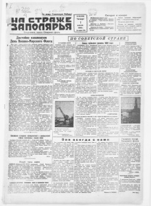 L / <ч l i fA " f ' * 4 S $ - W За пашу Советскую Редину! Ы Н зал Г Ежедневная газета Северного флота И IB S (3141), Четверг 1 июля 1948 г. Г ч п щ п 114. | «| ' ■ : г ц £ - Ь Ъ Сегодня По Советской стране (1 стр.). К 1Б-летию Северного флота. Капитан В . Степанов. — Герой Николай Диденко |2 стр .).' Лейтенант С. Кузнецов. — На посту мичмана Малышева (2 стр.). Полковник М . Левин. — Повысить роль низовой печати в воспитательной работе (2 стр.). в номере: Заочное совещаний библиотекарей. Книгу — в матросские массы (3 стр.). Матросские досуги (4 стр.). Отклики на заявление министров иностранных дел 8 государств, принятое на совещании в Варшаве (4 стр.). Забастовка лондонских докеров (4 стр.); % достойно ознаменуем День Военно-Морского Флота Наша страна — великая морская держа ва. На многие тысячи километров прости раются ее морские рубежи. В защите соци алистического Отечества, в обеспечении государственных иптересов СССР Военно- Морской Флот, как составпая часть совет ских Вооруженных Сил, играет большую и важную роль. Большевистская партия, Советское правительство, весь нага народ проявляют пеустанпую заботу о том, что- ,0ы флот страны социализма был сильным и могучим, чтобы росла и крепла его боевая шить. Одним из ярких проявлепий этой сталинской всепародпой заботы и внимания является проводимый в пашей страпе еже годно День Военно-Морского Флота. Традиционным праздником всего совет- екего народа стал День Военно-Морского Флота — лень смотра его силы, могущест ва, его боевой готовности. «Советский на род, — говорил товарищ Сталин, — хочет Видеть свой флот еще более сильным и мо гучим. Паш народ создаст для флота новые боевые корабли и новые базы. Задача фло та заключается в том, чтобы неустанно го товить и совершенствовать кадры моряков, полностью освоить боевой опыт Отечествен ной войны, еще выше поднять морскую культуру, дисциплину и организованность в своих рядах». Еровпые интересы Советско го государства отражают эти слова великого вождя народов. В День Военпо-Морского Флота военные моряки подводят итоги своей борьбы за осуществление сталинских указаний, моби лизуют свои силы па дальнейшее укрепле ние боевого могущества флота — верного и надежного . защитника социалистической Родины. И нет для матроса, старшины и офяц«]>* более высокой чести, чем право рапортовать Родине о свопх достижениях и успехах в этой борьбе. В напряжепной боейой и политической подготовке, в упорной борьбе за совершен ствование воинского мастерства, за высо кую дисциплину, организованность п поря док встречают североморцы приближаю щийся День Военно-Морского Флота в этом году. Еа кораблях и в частях в разгаре летняя учеба — ответственный этап бое вой подготовки. Личный состав флота ре шает зажнейшие задачи, поставленные Министром Вооруженных Сил СССР. На успешное осуществление этих задач и должны быть мобилизованы все силы, все внимание военпых моряков в тни подготов ки к Дню Военно-Морского Ф.Тота. Надо, чтобы каждый матрос, старшина и офицер поставил своей целью и добился конкрет ных результатов в боевой и политической подготовке, в службе и дисциплине. . Мы имеем много примеров, покапываю щих подлинно деловую подготовку ко все народному празднику. С высокими показа телями в боевой учебе идут навстречу Дню Военпо-Моргкоп Флота артиллеристы мичмана Валянского. Не жалея сил на тренировки, занима
