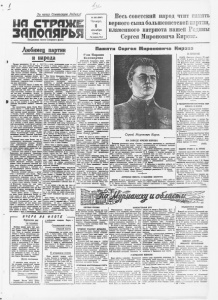 За нашу Советскую Родину/ на СТРАЖ Е за полярья Ежедневная газета Северного флота Л': 282 {3587) Четверг, 1 декабря 1 9 4 9 г. Год издания 13-й Весь советский народ чтит нажать верного сына большевистскойиартпи, пламенного патриота нашей Голины Сергеи Мироновича Кир Т-*> o t c * Любимец партии и народа Сегодня исполняется 15 лет е того скорбного дня, когда перестало биться го рячее сердце великого сына нашей Роди ны. любимца партии и народа, незабвен ного Сергея Мироновича Кирова. Злодей ский выстрел наемника фашизма, злей ших врагов рабочего класса — троцкист ско-бухаринских выродков оборвал пре красную, кипучую, полную борьбы и дер- вапий жизнь великого революционера, большевика, пламенного барпа за беоомерг, руководством иое дело коммунизма. Ленинград в Памяти Сергея Мироновича Кирз стт» Гия вгирова б е с с м е р т н о бу; в своих вдохновенных речах он разо блачал и громил врагов партии — троц- I связаны с Астраханью. кистов, звновьевцев, бухарншгев и прочих агентов империализма, стремившихся ра- АСТРАХАПЬ. Трудящиеся города свято чтут память С. М. Кирова, жизнь и рево люционная деятельность которого тесно Сотни рабочих, служащих, студентов и школьников еже дневно «посещают мемориальный музей сколоть ряды большевиков, сорвать соцпа- | С. М. Кирова, который пополнился сейчас диетическое строительство в пашей стра не. Имя Сергея Мироновича Кирова нераз рывно связано с Ленинградом — колы белью пролетарской революции. Под его трудящиеся превратили могучий индустриальный Сергей Миронович Киров! С каким вол- центр нашей страны. Здесь была создана пением, с какой гордостью произносим мы собственная «энергетическая база, получи- ото, овеянное славой, мужеством и бла- ли развитие огромное количество различ- городством гая! Как дорог нам светлый ных отраслей промышленности, иалажепо образ большевика, отдавшего все свои си- ! производство алюминия. строительство ды , всю свою неутомимую энергию за j бдюмжигов. Но главное — в Левшгграте счастье трудящихся, за победу социализма вырос новый человек, человек, воспитан- D нашей стране! И каждый советский че ловек с гордостью несет этот образ в ево- новыми фотодокумшггами. На фотографиях отображена жизнь предприятий и учебных заведений, носящих имя С. М. Кирова. ‘В кинотеатрах и парткабинетах, в от делении общества но распространению по литических и научных знаний организова ны выстдйжп о жизни и революционной деятельности пламенного борца за дело коммунизма. ★ ★ *• РИГА. Многочисленные экскурсии побы вали у памятных здапий, связанных с де ятели!гостью С. М. Кирова на посту участ ника мирных переговоров между РСФСР и Польшей, происходивших в Риге в 1920 ный Кировым, большевиками Ленинграда в духе беспредельной любви и преданности I гаду, см сердце, вдохновляясь им на славные своей Роднве, партии Ленгаа — Сталина, J Сохранилось одание бывшей «петербург- дела во имя расцвета и дальнейшего ук- в духе готовности защищать социалистнче- ' ской гостиницы» на Замковой площади, решения могущества любимой советской Родины. Вся неповторимая жизнь Сергея Миро новича Кирова — яркий пример беззавет ного служения делу коммунизма. Ближай ший соратник вождей революции Ленина н Сталина, Сергей Миронович твердо и неуклонно боролся за светлые идеалы чело вечества и, как зеницу ока, оберегал чи стоту бессмертного знамени ленини