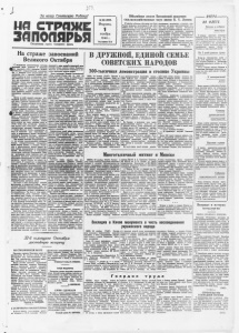 СТРАЖЕ ЗАПОЛЯРЬЯ Ежедневная газета Северного флота За нашу Советскую Родипу! К 258 (3563). Вторник, 1 ноября 1 9 4 9 г. Го* издания 13-й W W V ^ ^ ^ / V W W 1 Юбилейная сессия Всесоюзной академии сельскохозяйственных наук имени В. И. Ленина 29 октября в Москве в Колонной зале Дона Союзов закрылась проходившая 2 дня юби лейная сессия Всесоюзной академии сель скохозяйственных паук имени В. П. Ленипа, посвященная 20 -летию со дня ее основания. Сессия прошла под знаком торжества пере дового мичуринского учения, в обстановке тесного содружества ученых-новаторов с передовыми людьми колхозов и совхозов, ус пешно применивших на практике достиже ния мичуринской науки. Ученые, агрономы, зоотехники, председатели и звеньевые кол хозов с трибуны сессии рассказали о новых достижениях, полученных в научных лабо раториях, на полях, животноводческих фер мах, лесозащитных полосах. Поздравляя академию со славным юбилеем, они особо от мечали заслуги ее президента академика Т. Д. Лысенко, творчески развивающего и претворяющего в практику социалистиче ского сельского хозяйства учение Тимирязе ва, Мичурина, Вильямса. Участники сессии с большим воодушев лением приняли приветствие великому вож дю советского народа товарищу П. В. Сталину. (ТАСС). В Ч Е Р А НА ФЛОТЕ Беседа в кубрике авиаторов На страже завоеваний Великого Октября С величайшим патриотическим под'емом ^сове тский народ готовится к всенарод- Я вом у празднику— 32-й годовщине Великой ^•Октябрьской социалистической революции. Это — праздник всего прогрессивного че ловечества. Это — праздник великих побед нашего народа на пути к коммунизму. Каж дый советский человек стремится ознамено вать дни всенародного торжества новыми успехами в труде, новыми подвигами во имя Родины: сталевар — выплавить больше стали, шахтер— дать больше на-гора угля, колхозник — дать больше стране хлеба, рабочий завода — машин. Этим советские люди стремятся ускорить победное шествие воимунизма, приблизить прекрасное буду* щее. Вместе со всей страной встречают все народный праздник советские воины. Вели кий народ, Советское правительство, партия Ленина — Сталина поставили их на ответ ственную почетную вахту — стоять на страже исторических завоеваний Октября, бдительно охранять созидательный труд со- .Светских людей, обеспечивать государствен- 4 Ь ы е интересы социалистического Отечества, чувством законной гордости за свою Ро дину — могучий Союз Советских Социали стических Республик матросы, солдаты, старшины, сержанты и офицеры нашего флота отдают все силы упорному труду и учебе; чтобы быть достойными возложен ных на/них задач, чтобы быть достойными замечательных традиций Советской Армии ж Военно-Морского Флота, сложившихся в боях 8 а торжество дела коммунизма, за честь и независимость нашего государства,- рояцеинаго Великим Октябрем, созданного великим Лениным и великим Сталиным. Вся история советских Вооруженных Сил это история самоотверженного служения народу, социалистическому государству, Ядеям партии Ленипа — Сталина. Создан ные в революционных битвах нашего на рода против эксплоататоров и угнетателей, против белогвардейщины и чужеземных изветчиков, советские Вооруженные Силы Еа протяжении почти тридцати двух лет героически пресекали посягательства меж дународного империализма на честь и неза висимость. нашей Род