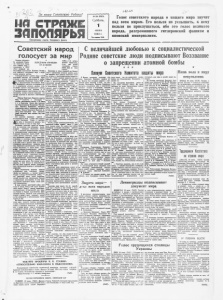 I Г ' I I За нашу Советскую Родину! ►AAA^ u a с т р о ж е за попярья Ежедневная газета Северного флота N: 154 (3767). Суббота, 1 июля 1950 г. Гол издания 14-й. Г t f i - ь ъ • г Голос советского народа о защите мира звучит над всем миром. Его нельзя не услышать, к нему нельзя не прислушаться, ибо это голос великого народа, разгромившего гитлеровский фашизм и японский империализм. Советский народ голосует за мир Сегодня публикует ся резолюция Плену ма Советского Коми тета защиты мира о проведении в СССР сбора подписей под Воззванием Постоянного Комитета Всемир ного конгресса сторонников мира о запре щении атомного оружия. Советский Комитет защиты мира в своей резолюции отмечает, что советский народ вст{>етпл с полным единодушием и одобре- « ем Заявление Верховного Совета СССР в кш с предложениями Постоянного Коми- ;а Всемирного конгресса сторонников ми ра о запрещении атомного оружия, уста новлении строгого международного контро ля за исполнением этого решения и об объявлении военным преступником того пра вительства, которое первым применит это оружие агрессии и массового уничтожения людей. «Пленум Советского Комитета защиты мира, — говорится в резолюции, — считает необходимым начать с 30 июня с. г. в Советском Союзе сбор подписей под Стокгольмским Воззванием Постоян ного Комитета Всемирного конгресса сторонников мира о запрещении атомного оружия. Пленум Советского Номитета за щиты мира призывает всех советских людей поставить свои подписи под этим Воззванием». Это решение выражает единую и несокрушимую волю к миру всех народов гулкого Советского Союза — могучего Л Ь т а мира п безопасности народов, зна- ™Лспа борьбы за мир во всем мире. Миллионы советских людей на прошед ших за последние дни собраниях, посвя щенных решениям Верховного Совета (’ССР, с огромным патриотическим под’емом и исключительным единодушием одобрили Заявление Верховного Совета СССР. Мил лионы простых советских людей.— рядо вые труженики заводов, шахт, новостроек, колхозных и совхозных полей, представи тели нашей народной интеллигенции под няли свой голос в защиту мира, за мудрую сталинскую миролюбивую внешнюю поли тику Советского правительства. Этот живой отклик миллионов — новое яркое выра жение моральн 1 >-политического единства сг-ветсвого общества, свидетельство того, что в советской стране народ и правитель- ство едины в своем стремлении отстоять мир, в своей борьбе против происков им периалистических поджигателей войны. Голос советского народа в защиту мира эзучит над всем миром. Его нельзя не ус лышать, к нему нельзя не прислушаться, ибо это голос великого народа, разгромив шего гитлеровский фашизм и японский им периализм. • Всему человечеству известна великая историческая роль советского парода. «Ныне все признают, — говорил товарищ Сталин в период Отечественной войны, — что советский народ своей самоотвер женной борьбой спас цивилизацию Европы от фашистских погромщиков. В этом вели кая заслуга советского народа перед исто рией человечества». В годы суровых испытаний войны наш народ по праву стяжал себе славу героиче ского народа. Вокруг страны социализма, последовательно отстаивающей дело мира, Есе больше и больше сплачиваются миро любивые народы. Мощный голос советского парода в защиту мира вызывает новый под'ем актпвпостн в международном лагере б