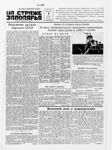г-ss-M За нашу Советскую Родину! уя СТРАЖЕ ЗАПОЛЯРЬЯ Г а з е т а С е в е р н о г о фл о т а Бр а т ски й привет великому китай ском у народу, успешно борющемуся за под'ём народного хо зяй ства и к ул ь т урЫ , за индустриализацию странЫ , за построение основ социализма! Да зд р а в с т в у е т и п р о ц в е т а е т нерушимая друЖба и со тр уд н и че с тво советского и китайского народов — могучий ф а к тор мира во всём мире! (Из Призывов ЦК КПСС к 37-й годовщине Великой Октябрьской социалистической революции). Нерушима дружба народов СССР Советские люди встречают славную дату в истории своей Родины — 37-ю годовщину Великой Октябрьской социа листической революции. С чувством ог ромного удовлетворения и законной гор дости обозревают они пройденный нашей страной путь — путь самоотверженного труда, героической борьбы и всемирно- исторических побед. Эти победы, достиг нутые под испытанным (руководством Ком мунистической партии, сделали^ нашу страну могучей социалистической дер жавой с высоко развитой промышленно стью и самым передовым в мире сель ским хозяйством. День ото дня повы шается благосостояние нашего народа, все ярче расцветает жизнь на необозри мых просторах советской земли. Одним из источников силы и непобеди мости нашего государства является неру шимая дружба народов СССР — величай шее завоевание Октябрьской социалисти ческой революции. Раскрепостив народы России, ликвидировав национальный гнет и вековую национальную роэнь, Октябрь ская революция создала невиданные в истории условия и возможности для брат ского сотрудничества всех народов, насе ляющих нашу многонациональную Роди ну. Дружба народов СССР есть результат гигантской деятельности Коммунистиче ской партии, последовательного и неуклон ного осуществления ее мудрой националь ной политики. Политика партии обеспе чила создание и укрепление великого Союза Советских Социалистических Рес публик, преобразила жизнь ранее угне тенных народов, вывела их на широкую и светлую дорогу развития экономики и культуры. Во всех республиках, входящих в со став Союза ОСР, создана и успешно раз вивается крупная социалистическая про мышленность, идет в гору колхозное про изводство, опирающееся на первоклассную сельскохозяйственную технику и новей шие достижения науки. До Великой Октябрьской социалистиче ской революции в Узбекистане, напри мер, совершенно не было развитой про мышленности. Теперь здесь имеются ма шиностроительные заводы, текстильные фабрики и другие предприятия крупной промышленности. Построенный за годы Советской власти Беговатский металлур гический завод снабжает металлом и про катом не только Узбекистан, но и дру гие республики Средней Азии. Только за три довоенные пятилетки в Узбекской ССР было построено 515 крупных про мышленных предприятий. В годы Вели кой Отечественной войны и в послевоен ный период здесь введено в строй еще 500 промышленных предприятий. Замечательные перемены произо шли в каждой союзной республике. Жи вя в единой братской семье, при помощи русского народа трудящиеся всех наций, населяющих СССР, добились грандиоз ных побед в хозяйственном и культурном строительстве. В нашей стране созданы все условия для подлинного расцвета культуры национальной по форме, социа- этической по содержанию. Благодаря этому в союзных республиках растет сеть учеб