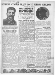 ВЕЛИКИЙ ВЕДЕТ НАС К НОВЫМ ПОБЕДАМ Пролетарии всех стран, соединяйтесь! ПО ЛЯ РН А Я п р а в д а Орган М у р м а н с к о г о О К В К Т 1 ( б ) , О И К ‘ а я О С П С № 1 (2474) I 1 ЯНВАРЯ ВТОРНИК 1935 ГОДА № 1 (2474 ) СЕГОДНЯ ОТКРЫВАЕТСЯ ЧЕТВЕРТЫЙ ОКРУЖНОЙ — С.ЕЗД СОВЕТОВ — новый год щ и ш с ш е о н о г о НАСТУПЛЕНИЯ „СИЛЬНАЯ И МОЩНАЯ ДИКТАТУРА ПРОЛЕ ТА РИА Т А—ВОГ, ЧТО НАМ НУЖНО ТЕПЕРЬ ДЛЯ ТОГО, ЧТОБЫ РА ЗВЕЯТЬ В П Р А Х ПОСЛЕДНИЕ ОСТАТКИ УМИРАЮ­ ЩИХ БЛАССОВ ‘ (СТАЛИН) ПОД ЗНАМЕНЕМ СОВЕТОВ 'Лі J—r Ч, . .ИГ.1 ■ '------ ■— СТАТЬЯ ПРЕДСЕДАТЕЛЯ М УРМ АНС КО ГО О КРИСПО Л КОМ А П. М. ГОРБУНОВА Четыре года, отделяющие нас от последнего с‘езда советов, знамена­ тельны величайшими успехами во всех областях хозяйственной, поли­ тической и культурной жизни Союза. Грандиозные победы в индустриали­ зация страны и коллективизации сельского хозяйства одержаны 8 а этн годы в результате правильной политики ленинской партии и ру­ ководства ЦК ВКП(б) во главе с великим вождем тов. Сталины*. Исключительное внимание и по­ стоянная помощь Центрального Ко­ митета ВКЩб) и правительства хо­ зяйственному развитию края, исто­ рическое посещение Мурманска 22-го июля 1933 г. вождем рабочего класса и трудящихся тов. Сталиным, с ближайшими его соратниками тт. Варешимвым и Кировы», обес­ печили рабочим и трудящимся Мур­ манского округа вместе с рабочим классом всей страны одержать победы, невиданные в истории су­ ществования этого края, считавше­ гося царизмом бесполезной и бес­ плодной пустыней. Под руководством Ленинградского Обкома ВКП(б) и лично тов. Кирова и Ленинградского Облисполкома про­ летарии Мурмана в беспощадной борьбе с классовым врагом, преодо­ левая трудности, создали в этом „бесплодном 4 крае крупнейшие от­ расли промышленности и транспорта с передовой техникой. Враги рабочего класса оборвали яркую жизнь бесстрашного рево­ люционера, но дело, за которое так пламенно боролся С. М. Киров, будет так же победоносно двигаться вперед, под славным, испытанным руководством ленинского ЦК ВКП(б) и великого Сталина. Рыбная промышленность Мурмана за эти годы резко выдвинулась вперед оставил позади основной сельдяной район в Союзе — Каспий. Проблема использования гидро­ энергетических ресурсов многочислен­ ных рек Кольского полуострова для нужд социалистического строитель­ ства стала практически разрешаем* мой задачей сегодняшнего дня. В 1934 году пущена первая очередь Нивской гидростанции, энергия этой станции уже течет по проводам для апатитовых рудников, обогатитель­ ных фабрик К и р о в с к а . В конце 1933 года широко развернуто стро­ ительство Туломекой гидростанции, находящейся в 20 клм. от Мур­ манска. Нужно особо отметить успешное разрешение проблемы создания на Кольском полуострове промышлен­ ности стройматериалов, что имеет большое народно-хозяйственное зна­ чение. Мощность уже построенных кирпичпых заводов определяется в 25 млн. шт. кирпича в год. Годовой план всей промышленно­ сти округа ожидается к вы полнепию в размере 97—98 проц. в ценно­ стном выражении и дает прирост продукции на 45 проц. к 1933 г. При значительном перевыполне­ нии плана рыбной промышленности в большом прорыве оказались апа­ титовая промышленность по выра­ ботке концентрата, недовыполнив план на 24 проц., и лесозаготовки, давшие только 89 проц. годового плана. Кроме того чрезвычайно пло­ хо выполнен план—на 75 