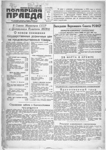 Обязательні ІГоеуітРсАвиий»* -- Ь й Й Г‘ 95-ЪІІ пролетарии вЬ&с>твак, | соединяйтесь! Год издания XXXIII В- связи с успехами, достигнутыми в 1951 году в области промышленного и сельскохозяйственного производства, ростом произ водительности труда и снижением себестоимости продукции Советское Правительство и Центральный Комитет ВКП(б) сочли возможным осуществить с 1 апреля 1952 года новое—пятое по счету—снижение государственных розничных цен на продовольственные товары мас сового потребления. ВТОРНИК, АПРЕЛЯ ОРГАН ИУРМАНСНОГООБЛАСТНОГО И ГОРОДСКОГО КОМИТЕТОВ ВКП(6) И МУРМАНСКОГО ОБЛАСТНОГО СОВЕТА ДЕПУТАТОВ ТРУДЯЩИХСЯ В Совете^ Министров СССР и Центральном Комитете ВКП(б) О новом снижении государственных розничных цен на продовольственные товары Заседание Верховного Совета РСФСР ИНФОРМАЦИОННОЕ СООБЩЕНИЕ В св я зи с успехами, достигнутыми в 1951 году в о б л а с т и , промышленного н сельскохозяйственного п рои з водства, ростом производительности т р у д а и снижением себестоимости продукции Советское П р ави тел ь ство и Ц ен тр альны й К оми тет В К П ( б ) сочли возможным осу ществить с 1 ап р ел я 1952 года новое — пятое по счету — снижение государственных розничных ц ен н а продо вольственные то в ары массового потребления. С овет М инистров С С С Р и Ц К В К П ( б ) постановили : 1. С ни зи т ь с 1 ап р ел я 1952 г. государственные р о з ничные цены н а продовольственны е то в ары в следующих разм ерах : Молоко, молочные продукты и молочные консервы Сы р советский, швейцарский , голландский и другие сыры Местные сыры / М асло растительное М асло арахисовое и косточковое М ар гарин Соусы -майонезы Мороженое Сахар, кондитерские и бакалейпые т о в а р ы С ахар — песок и р аф ин ад на 10 К ар ам ел ь зав ерну тая , мягкие конфеты , шоколад и дру гие сахаристы е кондитер ские и зд ели я н а 10 К ар ам ел ь н езав ерн у тая н а 15 Печение, вафли , кексы , тор ты , пирожные, пряники , сухари и другие кондитерские и зд ели я и з муки н а 12 Варенье, дж ем и ж еле на 10 Витамины « а 10 Ч ай н атуральный на 20 К оф е н атуральный н какао на 15 Кофейные напитки на 1C С оль на 30 Уксусная эссенция н а 15 Хлеб цеченый, мука и макароны Х л е б рж аной н а 12% Х л е б и з пшеничной обойной» мухи н а 12% Х л е б пеклеванный в а 15% Х л е б и з пшеничной сортовой муки, булки, баранки и дру гие хлебо-булочные и зд е ли я н а 15% М ук а рж а н а я в а 12% М ук а пш еничная о бойн ая на 12% М ук а рж а н а я пеклеванн ая с е ян ая на 15% М у х а пш еничная сор то в ая н д р у г а я мука н а 15% М акароны , лаііш а н другие макаронные и зд е л и я на 15% 29 карта в Еремло состоялось шестое заседание Верховного Совета РСФСР. В Большом Кремлевском Дворце собра лись депутаты-посланцы всех народов, населяющих Российскую Федерацию — первую среди равных шестнадцати союз ных республик. В течение трех дней народные избран ники обсуждали Государственный Огоджет РСФСР в а 1952 год, являющийся яркнм выражением неустанной заботы партии н правительства о дальнейшем развитии со циалистической экономики н культуры, о повышении материального благосостояния трудящихся. Депутаты единодушно одо брили новый бюджет республики. В зале присутствуют многочисленные гости — стахановцы предприятий столи цы, деятели науки н -техники, литерату ры и искусства. 7 часов вечера. В правительственных ложах появляются товарищ И. В. Сталин, товарищи В. М. Молотов, Г. М. Маленков, Л. П. Берия, 