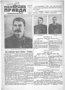 Обязательный Год издания ХХХШ <рик, соединяйтесь! Да здравствует 1 М ая— день международной солидарности трудящихся, день братства рабочих всех стран! Под знаменем Л е н и н а , под водительством Сталина — вперед, к победе коммунизма! ОРГАН МУРМАНСКОГО ОБЛАСТНОГО И ГОРОДСКОГО КОМИТЕТОВ ВКП(б). И МУРМАНСКОГО ОБЛАСТНОГО СОВЕТА ДЕПУТАТОВ ТРУДЯЩИХСЯ Военно-Морской Министр С С С Р вице-адмирал Н . Г. К У З Н Е Ц О В Военный Министр ССС Р М арш ал Советского Сою за А . М . ВА СИ Л ЕВ С К И Й \ г. Москва В ознаменование международного праздника трудя щихся приказываю: Сегодня, 1 М ая , произвести салю т в столице нашей Родины — Москве, в столицах союзных республик, а также в Калининграде, Львове, Хабаровске, Влади востоке и в городах-героях: Ленинграде, Сталинграде, Севастополе и Одессе — двадцатью артиллерийскими залпами. Д а здравствует наш великий советский народ и его доблестные Вооруженные. Силы! Д а здравствует Советское Правительство! .. Д а . здравствует, .п а р ти я 'Л ен и н а—Сталина — вдох новитель и организатор всех наших побед! Слава нашему великому учителю и вождю, гениаль ному полководцу товарищу С Т А Л И Н У ! ВоеинЫй Министр Союза ССР Маршал Советского Союза А ВАСИЛЕВСКИЙ. Товарищи солдаты и сержанты! Товарищи офицеры и генералы! Сегодня советский народ и его доблестная Совет ская А рм ия празднуют 1 М ая — день международной солидарности трудящихся. Крупными победами, достиг нутыми под руководством большевистской партии, от мечаем мы этот день. Приветствую и поздравляю вас с днем 1 М ая и желаю всему личному составу Советской Армии в предстоящий летний период обучения еще настойчи вее совершенствовать военные и политические знания, неустанно овладевать оружием и боевой техникой, все мерно укреплять дисциплину, повышать бдительность и боевую готовность. І і і знаменем партии Ленина— Сталина Сегодня — 1 Мая — день междуна родной солидарности трудящихся, день братства рабочих всех стран. Под сенью красных знамен вышлн се годня на улпцы трудящиеся всех стран. В обстановке- всемирно-исторических побед в строительстве, коммунизма, достиг нутых под руководством большевистской партии,- под- водительством великого Сталина, гордые за своп успехи, отмечают славный праздник советские люди. С та кой же гордостью демонстрируют своп до стижения в строительстве новой жизни трудящиеся стран народной демократии, великого Китая, Германской Демократиче ской Республики. . . . • Трудящиеся всего мира демонстрируют сегодня свою сплоченность в борьбе про- таэ агрессоров п поджнтателой новой вой ны, за мир, за демократию, за социализм.- . В этот всемирный праздник взоры всех трудящихся обращены s великому Совет скому Союзу — . твердыне дружбы и сла вы народов нашей страны, несокрушимо му оплоту ннра во всем мнрс. Огромные преимущества, заложенные в социалистическом строе, позволили совет скому народу в исторически короткий послевоенный период не только залечить раны, нанесенные войной, самой жесто кой из всех войн, но и _ значи тельно двинуть вперед развитие социали стической экономики, культуры, •науки, искусства. В 1951 году в нашей стране выпущено промышленной продукции в два раза больше, чем в предвоенном 1940.ro- ду. В первом квартале 1952 года валовая продукция всей промышленности. СССР возросла по сравнению с первым кварта лом 1951 года па 16 процентов. Зна