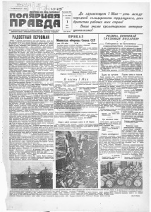 і - ,‘^язательный экз. Г r - 5 S -W f Пролетария всех ея/рот, соединяйтесь! г°д зм \ і\ \ t ' \ ! .О Л і і ІШ р і і I ff: 103 (7825) | I * І СУББОТА, i 1 ОРГАН МУРМАНСКОГО ОБЛАСТНОГО И ГОРОДСКОГО КОМИТЕТОВ КОММУНИСТИЧЕСКОЙ ПАРТИИ СОВЕТСКОГО СОЮЗА И МУРМАНСКОГО ОБЛАСТНОГО СОВЕТА ДЕПУТАТОВ ТРУДЯЩИХСЯ МАЯ. 1954 г. Цена 20 коп. Да здравствует 1 Мая — день между народной солидарности трудящихся , день братства рабочих всех стран! Выше знамя пролетарского ционализма і интерна - АДОСТНЫЙ ПЕРВОМ! Сегодня — радостный, торжественный день, ликующий Первомай. По традиции, установившейся 65 лет назад, трудящие ся всего мира в этот день организованно выходят на улицу, демонстрируя проле тарскую солидарность, свое единство. Никогда и ш ігд с Первоман не был н по ног быть таким лучезарным н счастли вым, как в советской стране, ка к в стра нах народной демократии, как в великом ыародном Китае. Это и понятно. Ведь в Советском Союзе, в Китайской Народной Республике, в странах народной демокра тии трудящиеся свободно, без всяких пре пятствий выходят па первомайскую демон страцию. Они несут над своими ярко укра шенными праздничными- колоннами алые знамена свободы, транспаранты, плакаты, диаграммы, рассказывающие о величай ших достижениях в строительстве повой жизни, о плодах освобожденного от экс плуатации, вдохновенного творческого тру да, о решимости трудового народа и впредь неустанно бороться за мир во всем мире, против поджигателей войны. Наша славная могучая советская стра на встречает Цервомай в расцвете своих сил, идущая к заветной цели — комму низму Под руководством Коммунистиче ской партии в Советском Союзе осущест вляется величественная программа даль нейшего развития производительных сил страны, еще большего роста благосостоя ния трудящихся, начертанная в решениях XIX съезда КПСС, в решениях сентябрь ского и февральско-мартовского Пленумов ЦК партии, в постановлениях пятой сес сии Верховного Совета СССР третьего со зыва и на днях закончившейся первой сессии Верховного Совета СССР четверто го созыва, в решениях партии и прави тельства. За прошедшие три годз пятой пятилет ки выпуск промышленной продукции в нашей стране увеличился на 45 процен тов, при этом производство средств произ водства водросло на 4G процентов. В Советском Союзе человек находится в центре внимания. У нас все делается для блага человека, для его всестороннего ростз. В настоящее время в нашей стране решается грандиозная задача по созданию в короткий срок обилия предметов народ ного потребления, продукции сельского хозяйства. За три года пятой пятилетки выпуск предметов потребления в СССР возрос на 43 процента* реальная ’зара ботная плата рабочих и служащих вырос ла на 30 процентов, а общая сумма дохо дов рабочих и служащих и доходов кре стьян в сопоставимых ценах возросла на 34 процента. На необъятных просторах социалисти ческой державы строятся мощные гидро электрические станции, возводятся пред приятия различных отраслей промышлен ности, прокладываются оросительные ка налы, подшкіаются целинные земли, ши роким фронтом идет строительство куль турно-просветительных учреждений, жи лищ. Н все это делается для блага совет ского парода строителя коммунизма. Советские люди знают, что их труд идет на расцвет любимой советской Родины, на улучшение жизни самих трудящихся и потому не жалеют сил в тру
