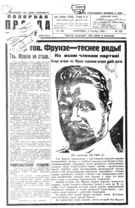 г** ролепшргш всех стран , соединяйтесь! Л Я Р Адрес тш т СБЮБСЩЛ. Твлвфон 25 - Прием ежедневно: от 10 ч. утра до 5 ч. дня Редакция оставляет за собой право сокра щать к изменять рукописи, обратно рукописи не возвращаются а отдельного номера 7 коп. П О Д П И С Н А Я ПЛА ТА : ftA ОДИН ЗКСС» • « • • • • • I руб. ЭСД, С пересыпкой во все мести, Реся . х р. 20 ж. яоя. Цена за об‘язления в гак .Полярная Правда. Строка петята позади текста ................................... 50 кон * * впереди н среди текста . . . 8* к#к По спросу п предложению т р у д а .......................... 3$ кете 0 б ‘ *зления об утере одного документа . . . . i руб ВТОРНИК, 3 Ноября 1925 г Газета выходит три раза в неделю* к Д V ' <&V' Г Ч ..-> ‘ v- гов. Фрунзе— теснее ряды! Тоь. Фрунзенестало. Умер т. Фрунзе. Горячее сердце, бившееся безграничной любовью к трудящимся и неиз меримой ненавистью по всем врагам трудя• щихся. смолкло навеки. Никогда больше его опытная рука не поведет рабоче крестьян ские колонны в Красный оой. Никогда больше его сокрущающий удар не будет разить врага. Гов. Фрунзе умер. .Еще один из старой же лезной Ленинской Когорты оставил ряды. Этз весть тяжелым камнем давит мозги каждого трудящегося нашего Союза и всего мира. Не гладкой и стройной тропой стелется жизненный путь т. Фрунзе. Этот путь крут и обрывист. Путь от упорной, неслыханно тяжелой классовой борьбы в тис ках самодержа ия и капитализма,— к Октябрю и от него через горнило гражданской войны, через зловонные трупы Колчака и Врангеля, Махно и Петлюры к окон чательному торжеству Рабоче-Крестьянской власти. На всем этом великом историческом пути т. Фрунзе был на линии огня Свою революционную деятельность т. Фрунзе начи нает еще очень молодым юношей. В конце 1904 года (19 лет от роду) вступает в ряды РСДРП , сразу при мыкая к крылу большевиков В начале 1905 года тов. Фрунзе является одним из организаторов и руководите лей большой стачки рабочих— текстильщиков Иваново- Вознесенского района. Уже первые шаги его револю ционной работы возбуждают внимание царских ищеек и опричников. Они начинают преследовать тов. Фрунзе. Вскоре его арестовывают и приговаривает к четырем годам каторжных работ. Через коооткий срок поотив него возбуждается новое лело и то*. Ф ч у н * Л. «У приговаривается к смертной казни с заменой каторжными работами сроком на О лет . Вплоть до 1914 года тов. Фрунзе провел в Алек сандровской, Николаевской и Владимирско и центральной каторжных тюрьмах. Затем вы ход на поселение, опять революционная работа, арест, побег и вновь за работу в рабочих кварт.лах. Февральская Революция застает тов. Фрунзе одним из руководителей революционного движения в Белорус сии. В октябре 1917 г. он спешит на подмогу москов ским рабочим и с 2-х тысячным отрядом прибывает в Москву и принимает участие в Октябрьских боях. В 1919 году ’тов. Фрунзе, командуя 4-мя армиями, наносит сокрушительный удар Колчаку. В конце 1920 года тов. Фрунзе перекидывается на южный фронт и разбивает на голову белогвардейские армии Врангеля , затем ликвидирует банды Махно и Петлюры . В начале 1924 года тов. Фрунзе назначается зам. Председателя Революционного Военного Совета СССР и вскоре становится его председателем. Жестокая смерть вырывает тов. Фрунзе в разгаре строительства нашей Красной Армии. Славный терн истый путь большевика. Он проделай в беззаветной преданности трудящимся : в неустанной борьбе , до послед него 