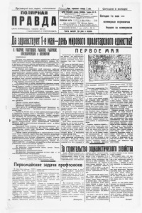 1 > Пролетарий всех стран , соединяйтесь! отдельного бомера; Д лов. С е г о д н я в н о м е р е : ПОЛЯРНАЯ ПРАВДА ОРГАН МУРМАНСКОГО ГУБКОМА ВКП (б) ГУБИСПОЛКОМА И ГУБПР0ФС0ВЕТА. ! 1 ' IflPEČ РЕАКЦИЙ площадь СВОБОДЫ. Телефон Ш 26. П^иеЦ ежедневно: от 10 ч. утра до 5 ч. дня. :Редакция оставляет за собой право сокращать и изменять рукописи, обратно рукописи не возвращаются. ППППНРНАЯ ПЛАТА* на оджн мес« по *о*л. подписке................. 7Б коп. ииДиЗЬПАи IlJiAi А. „ „ п о ИНДИВИД, подписке . . . 90 КОП. Цена за объявления в газ. «Полярная Правда». Стр. нонпарели позади текста. I p . 1 По спросу и предлож. труда Ьо к. * впер, и ср. тк. 1 р. 60 к. 1 06‘явленп* об утере одногодок. 1 р. Сегодня 1-е мая — всемирная переклична борцов за коммунизм ВОСКРЕСЕНЬЕ, 1 мая 1927 г . № 53 Газета выходи трм разав неделю. ТОВАРИЩ И ! Сегодня под красные знамена революции выйдет на боевой смотр действующая армия рабочего класса. Се годня железная поступь пролетарских батальонов ужасом и трепетом наполнит сердца заводчиков и банкиров. Се годня колокол мировой истории еще раз отзвонит гибель капиталистическому миру. В грозные дни справляют свой праздник рабочие колонны. Угроза новой бойни нависла над миром. Новым кровопусканием, океаном крови и слез мировой капитал хочет задушить революционный пожар во всем мире. Еще человечество не залечило ран нанесенных бойней 14 года, еще не истлели в земле кости десяти миллионов погибших, еще десятки миллионов изуродованных и ис калеченных бродят по улицам городов—а запах пороха и лязг оружия слышится во всем мире. Эта подготовка к войне маскируется фразами о мире и разоружении, которыми занимается грабительская Лига Наций вкупе и влюбе с социал-предателями. Империалисты начали крестовый поход против Ки тайской революции. 200 крейсеров и миноносцев скопи лось в портах Китая. За 15 миллионов долларов импе риалисты подкупили бывшего главкома революционных войск генерала Чан-Кай-Ши, изменившего делу револЮ' ции. Огнем и мечем думает международная буржуазия подавить освободительное движение в Китае. Сегодня пролетариат всего мира поднимет свой го лос протеста: Против угрозы новой войны! Против интервенции в Китае! За единый фронт пролетариев! Руки прочь от китайской революции! Проклятье из меннику Чан-Кай-Ши! — Громовым эхом разнесется по всему миру. Поход на Китай есть в тоже время репетиция войны с Советским Союзом. Ноты и заговоры, шпионы и про вокаторы все мобилизованы для того, чтобы вызвать нас на войну. На чистую воду зачинщиков новых войн— вот наше первомайское требование. Борясь за мир, мы. будем укреплять нашу Красную армию—вооруженный оплот пролетарской диктатуры. Обороне рабоче крестьянского отечества—честь и место сегодняшний день. Советский Союз вступил в период развернутого со циалистического строительства. Мы строим новые фаб рики/ заводы, новые суда, проводим электрификацию, развиваем сельское хозяйство. Сейчас перед пролетариатом и крестьянством Союза стоит много больших задач. Нам надо снизить розничные цены, жестче провести режим экономии, выкорчевать бю рократические пни, больше об'единить вокруг советов рабоче-крестьянский актив, укрепить союз бедноты и се редняков под знаменем коммунистической партии. Ни одного рабочего или рыбака, который бы не был активным участником социалистической стройки. Да здравствует строительство социализма! Д