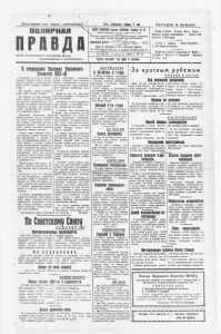 © л X Пролетарии всех стран , соединяйтесь: ПОЛЯРНАЯ ОРГАН МУРМАНСКОГО О К РУЖ КОМ А ВКП (б) ОКРИСПОЛКОМА И О КРП РОФ БЮ РО . £ |Ш1ТД1ЯШГ8 saaseps 5 ш е Сегодня в номере' АДРЕС РЕДЩ1Н площадь СВОБОДЫ. Телефон И 33. Приам •т*дневно: от 10 ч. утра до б ч. дня. Реддкция оставляет за собой право сокращать и изменять рукописи, •'братно рукописи не возвращаются. ПОДПИШИ ПЛАН: ва оджя мое. по*холл. подписжв. . . и • „ п о явднвжд. подписав . БО вон. . 65 жоп. Цепа аа объявления в газ, «Полярная Правда». Стр. юяпарелн позади гевста. I р. . , *пер. жcj. тв. 1р. 50ж. По спросу с предлож. труда Ьб в. 06‘жвлеяиж обутереоджогодож. 1р. ЧЕТВЕРх , 2 а в г у с та 1928 г. № 87 Газета ш орт трм раза i неделю, Япония и Китай.— Встреча Макса Гельца.— Польская реакция зашевелилась. — Провесе ком мунист в Финляндии. -г wv Горькийв Ткфлисс. — Поход Балтфлота. — 2 заем индустриализации. «-1Г1— »1111 Фельетоны: Случай сСоловьевым (И. Милов).— Гастроль т. Карпенко (А. Январский) — Мурманск 3] день — Суд. К очередному Пленуму Окружного Комитета МП (б) Созываемый на 3 августа Пленум Окружного Комитета партии обсудит вопроси партийного руководства ра ботой Советов и вопросы работы в тундре. Как первый, а равно и второй вопрос имеют большое значение. Мы прожили год после райониро вания Округа, год работы советов при новом их организационном по строении, это требует основательной проверки и внесения ряда практи ческих мероприятий для дальней шего оживления работы. Проведенное обследование ряда районов показало, что за последний год советы в округе имеют оживле ние в работе, в повестках дня раз бираемых вопросов, особенно в ни зовых звеньях, мы имеем вопросы конкретного местного порядка. Следует также отметить и боль шие пробелы в работе, основной из них—недостаточно, а местами и вовсе не привлечены массы, осо бенно деревни к участию в работе советов. Организационно-оформленные секции и комиссии при советах, ме стами застыли на организационных мероприятиях. Этот и ряд других недостатков отметит Пленум Окруж- кома и даст практические указания к устранению их. Второй вопрос— этот вопрос, по жалуй, новый на повестке дня на ших пленумов: итоги тундровой ра боты. II р а в д -&Tt>-не зн ачит, что мы не занимались вопросами тундровой работы в отдельных ее отраслях, но сейчас мы делаем по пытку подвести итог нашей работы и в области хозяйственно-экономи ческой и в области культурно-со циальной. В области хозяйственно-экономи ческой для Пленума будет чрезвы чайно важно установить насколько содействовали мероприятия Совет ской власти в поднятии оленевод ческого хозяйства, особенно бедней шей части населения. Оленеводческая тундра к Советской власти приобщилась значительно позднее остальной части населения Округа и хозяйственное и культур ное строительство среди оленеводче ского населения насчитывает всего. 4— 5 лет. Можем ли мы, что либо перед Пленумом выдвинуть в качестве на ших достижений? Несомненно, за этот короткий от резок времени, в необычайно труд ных условиях кое-что сделано. К примеру взять оленеводческую станцию, при устранении в ея ра* боте недостатков— она внесет эле менты культурности в оленеводче ское хозяйство. Постройка Ловезер- ской дороги имеет задачей связать центр тундры—Лоьозеро с железной дорогой, улучшить летнюю связь Округа с тундрой. В области культурно-социальных мероприятий тоже кое-что сдела