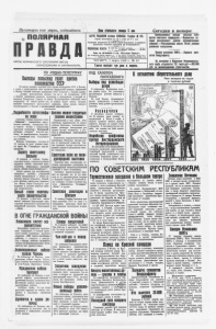 Пролетарии всех стращ соединяйтесьi . П О Л Я Р Н А Я Цен отцяыоге юмвра 5 ш Сегодня в номере: о р г а н м у р м а н с к о г о О К РУЖ КОМ А ВКП (б) ОКРИСПОЛКОМЯ И О КРП РОФ БЮ РО . АДРЕС РЕДАКЦИЙ площадь СВОБОДЫ. Телефон Щ 185. Прием ежедневно: от 10 ч. утра до б ч. дня. Редакция оставляет за Собой право сокращать и изменять рукописи, обратно рукописи не возвращаются, ПОДПИСНАЯ ПЛАТА: 1 * одни мес. по код л . подписке...................БО коп. • » . п о жнднвнд. подписке . . . 65 коп. Цена 8а об'явления в газ. «Полярная Правда*. Стр. конп&рели позади тек ста . I р. • . впер, и ср . тк. 1 р. 60 | По спросу ■ предлож . труда Ь© к. Объявления об у тер е одногодок. 1 р. ЧЕТВЕРГ, 1 марта 1928 г. № 26 Газета выходят трн раза i неделю. Провокационные выпады польских газет против советского полпредства.—Варшавская по­ лиция расстреливает рабочие предварительные собрания.—Революционные войска Китая успешно развивают наступление. Пленум исполкома КИМ‘а.—Передача само летов Воздухофлоту. На постройку в Мурманске Интернациональ­ ного клуба отпускается 120 тысячруб—200. 00 руб. на железнодорожное строительство. ' ПО Р А Д И О -Т ЕЛ Е Г РН Ф У Выпады польских газет против полпредства ССР По поводу выпадов польских газет против полпредства СССР в Польше, в связи с происходящим ныне процессом Белорусской громады, прибывший в Москву бывший советник полпредства СССР в Польше т. Ульянов заявил: „Должен категорически заявить, что ни я, ни полпредство СССР в Польше решительно никакого отношения к деятельности, в которой об- виняетея Белорусская Громада не имели. Провокационные сообщения газет направлены не только против нас, по должны будут помочь засудить деятелей белорусского крестьянского движения, поход против которого осуществляется в Польше с неслыханной жесткостоЮ". ^Подробности катастрофыiАнглияможетгордиться на море Советское учебное парусное судно „Товарищ", совершающее круго­ светное плавание, столкнулось око­ ло берегов Англии с итальянским пароходом «Алкантар». Последний затонул. „Товарищ" получил про­ боину, но самостоятельно направил­ ся в английский порт Соуптгемтон для ремонта. Команда «Алкантара» состояла из 23 человек, из коих уцелел толь- ко один. На «Товарище» все не­ вредимы. Дорогу советскому фильму 26 февраля в главном берлин­ ском кино-театре, основанном недавно народным союзом любителей кино­ искусства, показывался советский 4 « ь н Донец Санкт-Петербурга*. Фильм прошел при восторженных одобрениях публики, устроившей овацию находящемуся в театре ре­ жиссеру фильма Пудовкину. Видней­ шие критики единодушно признают, ^то «Конец Санкт-Петербурга» при­ надлежит к лучшим мировым образ­ цам киноискусства. Новый глава монголь­ скогоправительство 21 февраля в Монголии избран вместо умершего Церендорджи пред седателем монгольского правительства ближайший помощник Церендорджи —Амор. своимиминистрами Подписавший в свое время ноту советскому правительству по поводу «письма Зиновьева», постоянный то­ варищ министра иностранных дел Англии Грегори обвиняется в уча­ стии в спекуляции иностранной валютой. Выделенная парламентом комиссия подтвердила обвинение. Грегори уво­ лен от занимаемой должности. Тем­ ные проделки Грегори еще более по­ дорвали доверие к подлинности «пись­ ма Зиновьева». Советскоекино намеж­ дународное выставке Советские кино организации по­ лучили п