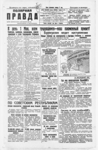 Пролетарии всех стран , соединяйт ПОЛЯРНАЯ П Р А ВДА ОРГАН МУРМАНСКОГО ОКРУЖКОМА ВКП (б) ОКРИСПОЛКОМА И ОКРПРОФБЮРО. \ t i i i 6ТЦ1И8П гакра 5 III Сегодня в номере: АДРЕС РЕДВД11 площадь СВОБОДЫ. Телефон X 33. Прием ежедневно: от 10 ч. утра до б ч. дня. Редакция оставляет эа Собой право сокращать и изменять рукописи, обратно рукописи не возвращаются. ПОДПИСНАЯ ПЛАТА: ~ ■ а оджя мес. по вохл . подписке..................Б0 ю н . • . . п о нидквид. подписке . . . 65 коп. Цена sa об'явления в газ. «Полярная Правда Стр. жонпарелн пов&дн текста. I р. . . впер, к ср . та* 1 р. 50 к. По спросу ж предлож. труда Ьо к. Об'хвлежиж об утере оджого док. 1 р . ВТОРНИК, 1 мая 1928 г. № 50 Газета шходп тр| раза i неделю. Рабочий класс всего мира празднует 1-еМая.— Новые гонения на коммунистов в Австрии.— Скандалы в впонском парламенте- Председатель НрымЦНК‘а приговорен к рас стрелу.—Мтогинонкурсаналучшеепредприятие.— Комитет по химизации народного хозяйства. Письмо мурманскимрабочимотрабочих Вены. — Совещание по улучшению народного питания.— План проведения дня печати. в лень 1 Ноя, всем трудящимся—наш пламеный привет! Рабочим, рыбакам, оленеводам, красно армейцам и всем трудящимся Нурмана День 1 го мая 1928 года,, международный рабочий класс встречает на рубеже 11-го го да Октябрьской революции. За 10 лет революции мы имеем ряд побед и достижений. Но враг еще силен. Мировая буржуазия не мо жет жить без новых империа листических войн. Под звон пустых фраз о ра зоружении, происходит напа дение на китайский рабочий класс, душится освободитель- ное движение в Никарагуа, в Индии и других угнетенных странах, делаются яростные попытки разгромить мощную организацию рабочего класса— „Союз Красных Фронтовиков4' в Германии; под прикрытием вывесок так называемой кон ференции по разоружению, происходит бешеное воору жение и военная подготовка. Международный пролета риат находится под ударом но вой кровавой бойни. Советский Союз стремится к миру. Несмотря на все про вокации империалистов, через все их попытки вызвать нас на войну, — мы добиваемся мира.. Но мировая буржуазия последнее время особенно упорно сколачивает единый фронт прошв нас. Последние сообщения говорят о попытках создать англо-франко-герман ский блок против Советского Союза. Провал наших предло жений на Женевской комедии разоружения, красноречиво го ворит о намерениях капита листов. Трудящиеся Мурманска! Будьте готовы к защите СССР, к защите мирного с о циалистического строительства от нападений империалистов! В этот день помните о готовящейся экономической интервенции, о контр револю ционном вредительстве внутри- страны. Труден путь социалисти ческого строительства в на шей стране. Отсюда ошибки, просчеты и масса недостатков в работе наших хозяйственных, советских и общественных ор ганизаций. 15-й партс'езд и недавно закончившийся пленум ЦК и ЦККнашей партии указали пути преодоления этих ошибок и не достатков. Только организованная мас совая борьба с ними может устранить трудности и пре пятствия, стоящие на пути по бедоносного строительства тру дящихся СССР. Рабочий и работница! Критика-мощное орудие в деле улучшения нашей работы. Используйте это орудие, не взирая на лица! Против бюрократизма, спяч ки, ротозейства и головотяп ства, против „семейности “ и хвостизма, против некультур ности в быту и в работе, про- гульщины, хулиганства, пьян