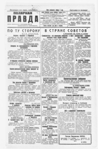 V Пролетарии всех стран , соедин G ? о- . всы V i s i l 9ТХС1Ы9Г1 I0 « p i S 181. ПОЛЯРНАЯ Ч X П Р А В Д В О Р ГА Н М У РМ А Н С КО ГО О К Р У Ж К О М А В К П (б ) О К РИ С П О Л КО М П И О К Р П Р О Ф БЮ Р О . Сегодня в номере: ЦРЕС РЕД1ЯЩ площадь ХВ0Б8ДЫ. Телефон Л 33. Прием ежедневно: от 10 ч. утр» до б ч. дня, Редакция оставляет за Собой право Сокращать и изменять рукописи, обратно рукописи не возвращаются. ПОДПИСНАЯ ПЛШ: ■а одвв мес. по волл. подписве...............БО воя. • • , по кадявнд. п о д п к с е * . . . 65 воп. Цена га об'явленкя в газ. «Полярная Правда». По спросу ■ предлож. трудж Ьь *, 06‘жвления об утере одвогодов. 1 р. Стр. вокпирелн по*аде текста. I р. . „ впер, е ср. тв. 1 р . БОк. ВТОРНИК, 2 октября 1928 г. № 1 1 2 Газета выходи трм раза в неделю. Социал-демократические министры— за по стройку бронеосца. — Америка против морского соглашении— Забастовка докеровв Австралии. Тов. Рыков посетил Украину. — СНК о до рожном строительстве.— Новые совхозы в Сибири. „Малыгин 1 прибывает в Архангельск.— Экс порт жемчужных раковин в Германию. — Уголь со Шпицбергена. ПО ТУ СТОРОНУ П У Т Ь :, К Р А С И Н А“ Встреча «Красина» в Норвегии 28 сентября, во время стоянки ледокола «Красина» в Тромсе (Нор вегия), ледокол посетили представи тели местной коммунистической ор ганизации и профсоюзов. На состояв шемся митинге выступали предста вители от организации и профс юзов, а также с ответным словом комис сар „Красина* Орас. Ночью ледокол вышел из Тромса. ПОД ПРИКРЫТИЕМ ПАКТА Америки не присоединяет ся к морскому соглашению Такие суда не выгодны Английское и французское мини стерства иностранных дел получили ноту от американского правительства по поводу заключенного недавно англо-французского соглашения. Соединенные Штаты отказываются присоединиться к соглашению ввиду того, что оно ограничивает только постройку крейсеров, с тоннажем до 10.000 тонн, а также подводных лодок наже 500 тонн. Соединенные Штаты считают подобное ограниче ние для себя невыгодным, ибо по добные суда как раз подходят для их нужд. в Румынии иочиноютсявоенные маневры В Румынии началась подготовка к проведению крупных осенних ма невров. Началась уже концентрация войск. Маневры состоятся в первой половине октября. ВОКРУГ ПОСТРОИКИ БРОНЕНОСЦА Социал-демократические лакеи голосуют зв постройку Рабочие переходят в коммунистическую партию 29 сентября, в связи с голосова нием социал-демократических ми нистров за постройку броненосца, в ряде гермавекгг городе Нибл-одаыся массовый переход социал-демократи ческих рабочих в компартию. В Средне-рейнском округе за последнее время создано 10 новых организаций компартии. К Л А С С О В А Я Б О Р Ь Б А Под лозунгом борьбы с фашизмом Массовая демонстрация в Базеле ской полиции в Швейцарии анти фашистского эмигранта Росси. После митинга состоялась большая массовая демонстрация, прошедшая с большим успехом. Швейцарская компартия орга низовала в Базеле массовый митинг под лозунгом борьбы с фашизмом. Поводом к митингу послужило не давнее похищение агентами итальян- Забастовка докеров в Австрали Столкновение между забастовщиками и штрейкбрехерами Происходящая в Австралии заба стовка докеров принимает чрезвы чайно острую форму. В порту Аде- лайна произошло столкновеБве между 2.000 докеров и штрейкбрехерами. В связи с этим южно-австралийское правительство об1явило страну на осадном полежении. Срочно орга