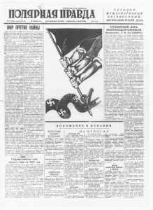 № 175 (3242) 1 августа 1937 года. ГОД ИЗДАНИЯ XV II, ОРГАН МУРМАНСКОГО ОКРУЖКОМА И ГОРКОМА ВКП(б) И ОКРИСПОЛКОМА Цена 10 коп. С Е Г О Д Н Я М Е Ж Д У Н А Р О Д Н Ы Й А Н Т И В О Е Н Н Ы Й , А Н Т И Ф А Ш И С Т С К И Й Д Е Н Ь МИРПРОТИВ ВОЙНЫ Зарево войны пылает над Испцш- •3. Дымятся развалины Люкоуцзяо в Неверном Кптае. Бонна официально ■е об'являлась, но она уже идет на юго-западе Европы п на Восток, ■ожирая тысячи жизнен, разрушая города и села. Кто виновен в этом, чья преступ а я рука сеет смерть? Ответ ясен. Фашизм — источник войны. Озверевшие мракобесы, пра вящие Германией, Японией и Ита лией, раздувают пожарище новой ми ровой империалистической бойни. Они превратили свои страны в тюрь мы и хотят поставить на колени весь мир. В беседе с американским журнали стом Рой Говардом вождь народов товарищ Сталин указал, что сущест вуют два главных очага военной опасности: Германия на Западе и Япония на Востоке. Жизнь с каждым днем все более и более подтвержда ет это мудрое сталинское определе ние. Германские и итальянские са молеты сбрасывают сотни и тысячи бомб на истерзанные кварталы Мад рида, убивают женщин и детей. Японская военщина вновь напала на Квта2. 29 июля японские летчики свыше 3 часов бомбардировали Тянь- цгинь, убивая беззащитных, лишая тысячи жителей кроеа. фашизм — это открытая, самал зверская, кровавая диктатура буржу азии. Фашизм не может существо вать без войны. Она ему необходи ма для подавления малейших стрем лений трудящихся к свободе, для того, чтобы любой ценой продлял жизнь издыхающего капиталистиче ского строя. Наглость фашистские заправил возрастает. Используя ко медию «невмешательства», исполь зуя попустительство слишком «миро любивых» (правителей Англии, Гит- мые пространства Арктики, а воро ны фашизма сеют смерть в цветущпх солнечных городах Испании. Фашизм смертельно ненавидит нашу любимую родную Красную Армию потому, что Краспая Армия — несокрушимый оплот мира, стальная оборона социа листического отечествз. Мощь СССР и крепнущий единый фронт не позволят фашизму органи зовать новую всемирную империали стическую войну. Уже свыше гота героический испанский народ с ве личайшей самоотверженностью защи щает от фашистского варварства нз только свою республику и свободу, но п дело всего передового п про грессивного человечества. В Китае растет ненависть к наглым япои- скпм захватчикам. сознании масс зреет вола к единству. Вокруг знамени на родного фронта в Испании, Франции и других странах сплачиваются но вые армии пролетариев, крестьян, интеллигенции. Коммунисты п соци алисты этих стран стремятся к соз данию едйной партии пролетариата. Это сплочение народных сил смер тельно для поджигателей войны. Вог почему фашисты и их слуги— троц кистско-бухаринские гады пытаются взорвать единство. Уничтожать мер завцев, укреплять ц расширять на родный фронт — вот путь к победе над фашизмом. Наше советское государство после довательно п твердо ведет политику мира. Могучая база этой политики— вооруженные силы СССР. Укрепление обороны, готовность всего нашего лер и Муссолини беспрерывно поры ;,ают в Испанию десятки тысяч сол- j наР°*а * сокрушительному отпору дат. танки и самолеты. Они требуют врагам, революционная прелоставпть главарю оанды мятеж ников Франко «права воюющей сто роны». Для чего это нужно интер вентам? Для того, чтобы окончатель 