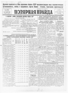 Дружной подпиской на заем укрепления обороны СССР продемонстрируем нашу социалистинескую организованность, любовь и преданность партии Ленина—Сталина, Советскому правительству! 2 июля 1937г. № 150 (3217) Год издание XVII ц е н а ю коп. ПРОЛЕТАРИИ ВСЕХ СТРАН, СОЕДИНЯЙТЕСЬ! ПОЛЯРНАЯПРАВДА О Р Г X н М У Р М А Н С К О Г О ОКРУЖКОМА и ГОРКОМА В КП ф И ОЕРИСПОЛКОМА. О ВЫПУСКЕ „ЗАЙМА УКРЕПЛЕНИИ ОБОРОНЫ СОЮЗА ССР" П О С Т А Н О В Л Е Н И Е Центрального Исполнительного Номитета и Совета Народных Комиссаров Союза ССР Идя навстречу многочисленным предложениям трудящихся Советского Союза и в целях привле чения их растущих сбережений на дело укрепления обороны Советского Союза, Центральный Испол нительный Комитет и Совет Народных Комиссаров Союза ССР постановляют: 1. Выпустить государственный внутренний заем укрепления обороны Союза ССР на сумму 4 мил лиарда рублей. Коаква, Брешь. 1 июля 1937 г. 2. Заем выпустить сроком на 20 лет с 1 декаб ря 1937 года по 1 декабря 1957 года, из 4 процен тов годовых. . 3. Облигации займа и доходы от них, в том числе выигрыши, освобождаются от обложения го сударственными и местными налЬгами и сборами. 4. Инструкции об условиях и порядке реали зации займа издаются Народным комиссариатом финансов ^Союза ССР с утверждения Совета На родных Комиссаров Союза ССР. Председатель Центрального Исполнительного Комитета Союза ССР М. КАЛИНИН . Председатель Совета Народных Комиссаров Союза ССР В . МОЛОТОВ. Секретарь Центрального Исполнительного Комитета Союза ССР И. АКУЛОВ. Утверждено Советом Народных Комиссаров Союза ССР 1 июля 1937 года У С Л О В И Я В Ы П У С К А Г О С У Д А Р С Т В Е Н Н О Г О В Н У Т Р Е Н Н Е Г О 1. Государственный внутренний заем укрепления обороны Союза ОСР подразделяемся па два выпуска: бес проигрышный о процентный. 2. Заем выпускается в облигаци ях достоинством в 500, 200, 100, 50, 25 и 10 рублей по беспроиг рышному выпуску я в 500, 200, 100 и 25 рублей по процентному выпуску. 3. Облигации достоинством в 500 и 200 рублей состоят соответствен но из 5 иль 2 сторублевых облига ций одной серии с пятью и или двумя номерами и дают право: а) по беспроигрышному выпуску— на пять или два выигрыша, которые одно временно падают на каждый из но меров, обозначенных на облигации; б) по процентному выпуску •— на процентный доход со всей нарица тельной стоимости облигации. Облигации, достоинством в 50, 25 и 10 рублен являются частями сторублевых облигаций и дают пра во на соответствующую долю ( ‘/г, */<, Vio) выигрыша или процентно ге дохода, причитающегося на сто рублевую облигацию. ПРИМЕЧАНИЕ: Облигации по 25 и 10 рублей выпуска ются лишь для расчетов с под писчиками в тех случаях, когда по сумме подписки не могут быть выданы облигации более крупного достоинства. 4. Оба выпуска займа делятся на разряды по 100 миллионов рублей в каждом разряде. Каждый разряд беспроигрышного и процентного вы пуска имеет 20 тысяч серий по 5.000 рублен в серии. Серии каж дого разряда беспроигрышного вы пуска имеют номера с Л» 20001 по X ' 40000, а процентного выпуска с Л ” 100001 по Л : 120000. 5. С течение двадцатнлетнего opcv- X.i займа выигрывает каждая обли гация беспроигрышного выпуска. Выигрыш» устанавливаются в 300(1. 1000, 500, 200, и 15tf руб лей на гтор\блевую облигацию, включая нарицательную етопмость оАлигацнк (100 рублей). Облигация, на которую пал вы игрыш, погашается п исключается «и дальнейших тиражей. •J. П.. беспроигрышному вмпуск