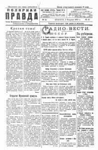 Пролетарии всех стран, соединяйтесь! П О Л Я Р И А П Р А Щ О р г а н М у р м а н с к о г о Г у б к о м а Р К П , Г у б и с п о д к о м а и Г у б п р о ф с о в е т а . Цена отдельного номера ю коп. Адрес р ю ш СВОБОДЫ. Телефон № 25- Прием ежедневно: от 10 ч. утра до Б ч. дня. Редакция оставляет за собой право сокра­ щать и изменять рукописи, обратно рукописи не возвращаются. ПОДПИСНАЯ ПЛАТА: еа одкв вес* . . . . . . . г руб. вон. С пересылкой во все лести. Ресд. I р. 8е К. •№- Цена за выявления в га». .Полярная Правда,. Строка петита позади текста ................................. 50 я*5®* • * впереди и среди текста . . I руй° — * в об утере докум. и предл, труда 40 N 13. ВТОРНИК, 3 Февраля 1925 г № 13 Газета выходит три раза в неделю К р е п и до союз ! д . И О - В Е С Т И . О С- С С- р . JI. Д. Троцнн освобожден от доляаосп Нарнэма во военным I норснш дедам, а на его место назначен М. В. Фрунзе. В проведения Ленинского «я» вета одно! вз задач является укрепление союза города с де­ ревней или, вернее, союза го­ родского пролетариата с деревен­ ской беднотой ■ средвячествов. Ог проведения в жизнь дан- юго и>вета зависит ве только дальне1виХ ход развития нашего советского хозяйства и твердость советсво! политики, во ■ ход ря-зватия вирово! социалистаче- свой революции. 11ролетарват должен быть про­ водников социализма в деревне. BiOr* 111 ве должны забывать вв ва одву хинуту; ве только ве «абывать, а проводвть твердо в беи всякого ослабления в жвзвь. В настоящее вревя весь СССР охвачен этим сознааиев. Сотая тысяч пролетариев ведут повсе­ дневную работу 8а укрепление втого союза i все усилия сосре­ доточены ва том, чтобы ваша деревня осознала необходимость тесной евязм со свовм вожатый пролетариатом города. Эга работа ве остается мерт­ во!, безрезультатно!. С важдыв дней сознание деревам роетет, по­ молняются ряды советских хо­ зяйственных м кооперативных ор- у ганмзяций, пополняются ряды г РКП (г.), РЛКСЛ . За счет б-дтяцкого элеиевта роетет сознание необходимости борьбы с кулачеством и т. п. Эю говорит 8а то, что курс верен, начатое нужно углублять, вновь будировать м каждый шаг вявоеваний в деревне укреплять прочным фундаментом Лениаиз- • враля, ва Торговой вясщадя по­ явился д]ховоЗ оркестр, поне- ' многу собираются вест вые жа= тели м в небольшое числе при- 98ЖЯ6 с побережий. Окояо поювивы первого св­ еряются ЯрмаэочнвЙ комитет в представители Губнсполкг в». Губ- пр ф ’овета, кооперативных и го- * зарстьеивых организаций м )в/Говцы, выступающие на яр- марке. В полоемне первого на три­ буне подвимаегся Я , варочный i комитет, м<длензо вззвваегся \ флаг м от ххеяи кохитета той. Ь: Яйцов объявляет «рмарку от­ крытой. В свое! речи т. ЯЗцов отме­ чает, что территория губернзв равна 180.000 кв. в^рст, что вследствие местных клихатиче- гСких условий части ее бывают эдМИДОЛ О оторваны от своего гу- - бернского центра, а потопу ко­ оперативные и государственные оргаавзацвм, выступающие в тор­ говле губернии, ве всегда внают ассортимента нужных товаров, ве внают, что ххенпо больие .^всего вужио населению в ярмяр- в?, на которую еЧдутгя как с ☆ В« блрежвй, так в уз турдпы, аря^вака вто шясавть. О^гаав- Все вто ве должно пройти в виво вашего Мурханского края. Мы являех'я одних из связы­ вающих эвеньев вашего СССР о тем хиром, который каждую минуту способен воспользоваться нашим упущением и использовать это в ннтере.ах капиталистиче­ ского миря, а потому союз про­ 