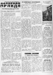 ПРОЛЕТАРИИ ВСЕХ СТРАН, СОЖДИНЯЙТІСЫ П О Л Я Р Н А Я Р Я В СУ Я ОРГАН МУРМАНСКОГО ОБКОМА И ГОРКОМА ВКП(б) И ОБЛАСТНОГО СОВЕТА ДЕПУТАТОВ ТРУДЯЩИХСЯ Г о д к з я а н и я X X I V . ОТ СОВЕТСКОГО ИНФОРМБЮРО № 72 (4763). Пятница, 2 апреля 1343 г. Цена 20 ноп, — и м а и а м — M a n я ш ч п п » ВЕЧЕРНЕЕ СООБЩЕНИЕ 30 МАРТА вели боя местного значения. Под прикрытием тумана советски© бой цы скрытно подобрались к одному опорному пункту противника и атаковали находившихся в нем гит леровцев. Немцы отступили из это го пункта, оставив на поле боя бе лее 100 трупо® своих солдат и офицеров1. В течение 30 марта на фронтах существенных изменении не про изошло'. Наим корабли в Черном лоре потопили транспорт противника водоизмещением в 2.000 тонн. ОБ И Н И Ц И А Т И В Е И А С С О Р Т И М Е Н Т Е Рукомойник, металлическая круж - 1 ка, щетка, для чистки одежды, рас ческа, пуговица — мелкие и име- 4jpe с тем необходимые в быту пред-; йгсты. Производство их не требует; сложного оборудования и может быть организовано на местаж сырьевой базе. Большие возможно-1 сти в- этом отношении представляют | металлический утиль, отходы лес- і ной и рыбной промышленности, в избытке имеющиеся в Заполярье. Нужна лишь инициатива и изобре тательность для того, чтобы пре вратить их в полезные вещи, нужные в быту. С начала 1943 года предприя тия местной промышленности и промкоопераций получили твердые планы "ыпуска продукции ширпот реба, ‘ -оглредусматривающие также I ходов, точный ассортиментизделий. Но уже I сырьем первые месяцы нового года пока зали, что многие руководители, ма стерских и артелей в погоне за количественными показателями не заботятся об установленном ассор тименте, о снабжении торговых «р- л аншаций разнообразными товарами широкого потребления и вместо 10 — 15 наименований выпускают ка кое-либо одно изделие. Артель «Раз. йопром» выполнила, задание по ширпотребу на. 184 процента. Но при более близком знакомстве с деятельностью артели выяснилось, что план выпуска посуды осуще ствлен всего лишь на 3 процента-, план производства, хозяйственного Бесспорно, что и мундштуки, и сапожная мазь, и чернила — ве щи необходимые. Но ни в коем случае нельзя пренебрегать выпус ком и других предметов ширпотре ба, тем более, что производство их предусмотрено планом. В оправдание всех этих нетер пимых фактов некоторые работники ссылаются на отсутствие соответ ствующего сырья. Несомненно, гораздо легче пользоваться сырьем, которое уже лежит на складе. Но этот путь обличает лишь непово ротливость отдельных руководите лей местной промышленности и промкооперации. 29 марта :частями нашей авиа ции на различных участках фрон та уничтожено или повреждено до 10 немецких танков, свыше 100 авто машин с войсками и грузами, по давлен огонь 7 батарей полевой и зенитной артиллерии противника. В Баренцевом море нашей авиацией потоплены 3 транспорта противника общим водоизмещением в 6.000 тонн. * * * На одном участке в районе сред него течения Северного Донца в течение дня происходили ожесто ченные бои с противником. Немцы силами танковой дивизии перешли в наступление, пытаясь прорвать нашу оборону. Действия своей ди визии противник, поддерживал силь ным огнем артиллерии и крупны ми силами авиации. Наше гвардей ское соединение под командованием генерал-майора Тихонова стойко Партизанский отряд, действую щий в одном из районов Орловской области, в