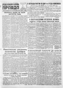 Ш 0J1ETA PUT ВСЕХ СТРАН. СОЕЩШЯРТЖСЪ! ПОЛЯРНАЯ Цена о тд . Н» (О и Н О Я Б Р Ь 1 С Р Е Д А 1933 г . № 2Š3 (2122) ГОД ИЗДАНИЯ XIII ОРГАН МУРМАНСКОГО О КРУЖ КОМА іЗКП(б) ОНН*а и ОСПС ОПЯТНАДЦАТИЛЕТИИGO ДНЯ І-гоС'ЕЗДАКОМСОМОЛА Постановление ЦК ВКП(б) от 11 октября 1933 года ОБЕСПЕЧИТЬ ВЫЛОВ 180 ТЫСЯЧ ЦЕНТНЕРОВ РЫБЫ Ноябрь и декабрь—решающие ме- так и немецкой конотрукцчи д о - ; ных глубинах от 90 до 100—110 са" сяцы в выполнении плана 4-го срочно возвращались в порт нз -за жни. Нп глубже, ни мельче—рыбы квартала и всей годовой программы аварий в машинах н всиомогатель- Севтралтреста. За эти два месяца ных механизмах, традфлот обязан выловить 180 ты - і Напряженное положение на базе сяч центнеров рыбы— 21,2 проц. j создавшейся в связи о ремонтной годового плана. Для выполнения пробкой, требовало четкого плани- этого задания необходимо обеспе - 1 рования возвращения судов на ба- чить средне-суточный вылов пОізу. Между тем, в октябре было флоту в 300 тонн. j несколько случаев одновременного Эго ваданне вполне реальное, прихода в порт по 5—7 траулеров ѵ *’ 1. ОдоІЗря* решение ЦК ВЛКСМ О п я т н а д ц а т и л е т и и Новосибирске, Баку, Магнитогорске, Сталинград#, Р о с т о в е , ■со дня первого с'езда комсомола* ЦК ВКП (б) п р е д л а г а е т на Доку, Горьком. всем партийным организациям: j а) Установить 250 (повышенных) стипендий имени ВЛКСМ а) Развернуть в связи с пятнадцатилетием к ом с ом о л а для лучших студентов Вузов и ВТузов, сельскохозяйствен- шйрокуіб^массодую политическую работу и о к а з а т ь в с е м е р - Ных и военно-морских школ. ную помощь комсомолу в выполнении им взятых в с в я з и с г) Предложить Наркомздравам республик и ВЦСПС уве- пятнадцатилетним юбилеем ооязательств перед п а р т и е й и личить в з і году количество мест в домах отдыха и санато- правительством. риях для рабочей молодежи и организовать в каждой респуб- б) Проверить во всех парторганизациях состояние пар- лике по одному дому отдыха для молодых ударников колхоз- тийного руководства комсомолом, наметив конкретные прак- ников тические меры по его улучшению, обсудить на специальном партдне вопросы работы ВЛКСМ, обеспечив лучшую п о с т а - Ноябрь и декабрь—месяцы большой уловистости в местах обычного ло ва тралфлота. В частности, в нояб ре ул^вы на один под’ем трала пе было. Затем он определил, что рыба держится на норд-вест. Эти данные позволили ему весь рейс держаться на рыбе, беря по тонне за под’ем, тогда как оосѳдииѳ трау­ леры брали по 0,2—0,3 тонны. Места о большой концентрацией рыбы обнаружили и РТ-65 и 80. . . _ Октябрь показал , что руковод Это еще белее осложняло междурей ства промыслового отдела и боль - сверх - 1 совый ремонт, увеличивало плановые простои. Огдѳл технической эксалоатации, шая часть капитанов весьма плохо знают свою промысловую базу, не умеют искать рыбу , не обычно не меньше, чем уловы июня теплотехнический сектор, угольная ' умеют на ней держаться . и июля. Гидрологические показания база, отдел снабжения—нот участки, І Плачевные итоги октября—распла- говорят о том, что в текущем году от работы котор х в значительной j та за пренебрежение к воиросам эти месяцы по своей продуктивно­ сти, по густой концентрации кося ­ ков будут выше, чем ноябрь и де­ кабрь 1931 и 32 г.г. Это, однако . не означает , что мере зависит число траулеров, на­ ходящихся в море. На сегодняш­ ний день они работают весьма пло­ хо научного изучения 