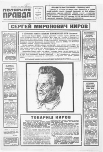Пролетарии вс\х стран, сЬвриияйтесы ЯВЖВЗЗЗІШ полярная Орган Мурманского ОК ВКП (б), ОИК'а и ОСПС №277 (2448) 2 ДЕКАБРЯ ВОСКРЕСЕНЬЕ 1934 г. Год изд. ХіѴ ПРАВИТЕЛЬСТВЕННОЕ СООБЩЕНИЕ 1 декабря , в 16 часов 30 минут , в гор . Ленинграде , в здании Ленинградского совета (бывший Смольный), от руки убийцы, подосланного врагами рабочего класса, п о г и б с е к р е т а р ь Центрального и Ленинградского Комитетов ВКП (большевиков) и член Президиума Ц И К СССР товарищ С Е Р Г Е И М ИРОНОВИЧ К И Р О В . Стрелявший задержан. Личность е го выясняется. СЕРГЕЙ МИРОНОВИЧ КИРОВ Ц е н т р а л ь н ы й И с п о л н и т е л ь н ы й Коми те т С о ю з а С С Р с глубокой печалью и звещ ает рабочих и рабо т­ ниц, колхозников и колхозниц , в се х трудящ ихся Сою ­ з а С С Р , что 1 д е ­ кабря в 16 часов 30 минут в гор . Ленин граде о т ру­ ки убийцы , —вр а га сове тской в л а с т и - погиб член Прези­ ди ум а ЦИК Сою за С С Р товарищ Ки­ ров, Сер гей Миро' нович. Президиум Ц ен ­ т р а л ь н о г о И спол ­ н и т е л ь н о г о Коми ­ т е т а С ою з а ССР . ОТ СО В ЕТА НАРОДНЫХ КОМИССАРОВ С С С Р Совет Народных Ком и ссаров Сою ­ з а С С Р с глубокой скорбью и звещ ае т рабочих , крестьян и в се х трудящ ихся Сою за С С Р , что 1 декабря в городе Ленин граде о т пре д а тель ской пули подосланно го вра ­ гам и рабочих и кр естьян убийцы погиб пламенный и сам оо тверж ен ­ ный боец з а дело комм унизм а , член Политбюро и с е к ­ р е тар ь Централь­ но го и Ленин град ­ с к о го Коми тетов ВКП(б), член Прези диум а ЦИК Сою за ССР Сер гей Миронович КИРОВ . Совет Народных Комиссаров твер ­ до уверен в том , что жизнь славно* го большевика , од­ ного из лучших ру­ ководителей н а ­ шей партии и с тр а ны , товарища КИ РОВА будет для в се х пролетарских революционеров примером борьбы с вр а гам и тр уд я ­ щ и х ся за дело пролетар ской ре­ волюции, з а побе д у коммунизма . С о в е т Н ар о д ны х К ом и с с а р о в Сою з а ССР . I СЕГОДНЯ, В 10 ЧАСОВ УТРА, В ОК ВКП(б)' СОЗЫВАЕТСЯ ЭКСТ­ РЕННОЕ СОВЕЩАНИЕ СЕКРЕТАРЕЙ ПАРТКОМОВ И ПАРТОРГОВ. ОК ВКЛ(б). I СЕГОДНЯ В 8 ЧАСОВ ВЕЧЕ­ РА. В БОЛЬШОМ ЗАЛЕ ДОМА КУЛЬТУРЫ,—ТРАУРНОЕ ЗАСЕ­ ДАНИЕ ПАРТИЙНЫХ, СОВЕТ­ СКИХ И КОМСОМОЛЬСКИХ ОР­ ГАНИЗАЦИЙ. ОК ВКП(б) ОТ ЦЕНТРАЛЬНОГО КОМИТЕТА ВСЕСОЮЗНОЙ КОМУНИСТЧЕСКОЙ ПАРТИИ (большевиков) Центральный Комитет ВКП(б) с великим прискорбием извещает партию, рабочий класс и всех трудящихся Союза ССР и трудящихся всего мира, что 1 декабря, в Ленинграде, от предательской руки врага рабочего класса погиб выдающийся деятель нашей партии, пла­ менный, бесстрашный революционер, любимый руководитель большевиков и всех трудящихся Ленинграда, секретарь Центрального и Ленинградского Комитетов ВКП(б), член Политбюро ЦК ВКП(б) товарищ С ЕР ГЕЙ МИРОНОВИЧ КИРОВ. Потеря товарища КИРОВА, любимого всей партией и всем рабочим классом СССР, кри­ стально чистого и непоколебимо стойкого партийца— большевика-ленинца, отдавшего^ всю свою яркую, славную жизнь делу рабочего класса, делу коммунизма, является самой тя­ желой потерей для всей партии и страны Советов за последние годы. Центральный Комитет верит, что память о товарище Кирове, светлый пример его бес­ страшной, неутомимой борьбы за пролетарскую революцию, за строительство социализма в СССР будет вдохновлять миллионы пролетариев и всех трудящихся на дальнейшую борьбу за торжество социализма, за окончательное искоренение всех врагов рабочего класса. ЦЕНТРАЛЬНЫЙ КОМИТЕТ