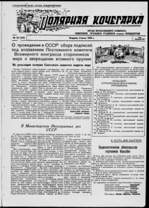ПРОЛЕТАРИЙ ВСЕХ СТРАН, СОЕДИНЯЙТЕСЬ! ■ > Г’ алярш иошлтя ОРГАН ПРОФСОЮЗНОГО КОМИТЕТА СОВЕТСКИХ УГОЛЬНЫХ РУДНИКОВ острова ШПИЦБЕРГЕН №> 58 (234) Вторник, 4 июля 1950 г. Год издания М О п р о в ед ен ии в С С С Р с б о р а подписей под воззванием П о с т о я н н о г о к оми т е т а В с е м и р н о г о н о н г р е с с а с т о р о н н и к о в мира о з а п р ещ е н и и а т о м н о г о о р уж и я Из резолюции пленума Советского комитета защиты мира Пленум Советскою коми тета защиты мира с огром ным удовлетворением отме чает, что советский народ встретит с полным едино душием и одобрением заяв ление Верховною Совета СССР в связи с предложе ниями Постоянного комите- та Всемирною конгресса сторонников мира о запре щении атомного оружия, установления строгого ме ждународного контроля за ис полнением этою решения и об объявлении военным преступ ником того правительства, которое первым применит это оружие агрессии и мас сового уничтожения людей. Верховный Совет СССР выразил уверенность в том, что движение сторонников мира, и прежде всего Сток гольмское воззвание Постоян ного комитета Всемирного получит единодушную под- дей поставить свои подпи- держку всего советского н а -1си под этим воззванием, рода. I Советский комитет защи- Все народы СССР всегда ты мира, под руководством горячо поддерживали и под держивают усилия органи зованного фронта сторонни ков мира, направленные на пользу дела мира, против поджигателей новой войны. Они не жалеют сил для у с пеха справедливою и благо родного дела — укрепления мира и дружбы между наро дами. Пленум Советского коми тета защиты мира считает необходимым начать с 30 июня с. г. в Советском Сою зе сбор подписей под Сток гольмским воззванием Посто янного комитета Всемирно го конгресса сторонников ми * ра о запрещении атомного которого будет щоходить кампания сбора подписей, выражает твердую уверен ность в том, что все совет • ские люди откликнутся на этот призыв. Подписывая Стокгольм ское воззвание, советские люди тем самым выразят свою преданность делу мира, свою готовность отстоять мир во всем мире, свою мо нолитную сплоченность во круг родной большевистской партии, свою беззаветную преданность великому знаме носцу, другу и вождю всех на родов товарищу Сталину. Советский комитет защиты мира: оружия. Пленум Советского комитета защиты мира при- J (Следуют персональные подписи K O H t p Q C C Q . СШОрОННИКОв МІірСіу ЗЫвает вссх советских АЮ~ Івсех членов Советского комитета). В Министерстве Иностранных дел СССР 27 июня посол США госпо- jи Северо-корейским режимом, Iкорейские власти дин А. Кэрк направил заме-1 правительство Соединенных Iкто стоит за них. Штатов просит заверения в том, что Союз Советских Со циалистических Республик не признает за собой ответствен ности за это неспровоциро ванное и ничем неоправдан- и на тех, стителю министра иностран ных дел СССР Громыко па мятную записку, содержащую заявление правительства США, следующего содержа ния: „Мое правительство пору-|ное нападение и что оно упо- чило мне обратить Ваше вни- требит свое влияние в отно- мание на тот факт, что Севе- шении Северо-корейских вла- ро-корейские войска перешли | стей с тем, чтобы они немед ленно отвели свои вторгшие ся силы". 29 июня, по поручению Со ветского правительства, Гро- мыко сделал господину А. Кэрку следующее заявление: „В связи с переданным Ва ми 27 июня заяв