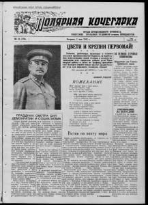 ПРОЛЕТАРИИ ВСЕХ СТРАН, СОЕДИНЯЙТЕСЬ! тятя ктгтя ОРГАН ПРОФСОЮЗНОГО КОМИТЕТА СОВЕТСКИХ УГОЛЬНЫХ РУДНИКОВ острова ШПИЦБЕРГЕН № 36 (306) Вторник, 1 мая 1951 г. Год издания 4-й ПРАЗДНИК СМОТРА СИЛ ДЕМОКРАТИИ И СОЦИАЛИЗМА ЦВЕТИ И КРЕПНИ ПЕРВОМАЙ! □ □ □ Рабочие, работницы, инженеры и техники угольной промышленности! Боритесь за^наиболь­ шее использование новой техники и полную ме­ ханизацию всех процессов добычи угля! Орга­ низуйте работу в лавах по графику циклично­ сти! Быстрее стройте новые шахты! Дадим боль­ ше угля для народного хозяйства страны! ( И з призывов Ц К В К П ( б ) к 1 мая 1951 г.). □ □ □ НИКОЛАЙ ГРИБАЧЕВ П О Ж Е Л А Н И Е Май —первых трав и гроз начало и чувства первого пора затем, чтобы оно звучало, как голос дружбы и добра; Май —это взлет мечты крылатой и пробужденье новых сил, чтоб их избыток был отрадой и счастье людям приносил. И потому всем, всем, с кем вместе мир изменять и познавать, мне хочется хорѳшей песни, любви и счастья пожелать, успеха в каждом деле честном, согретом помыслом живым, всем неизвестным и известным, прославленным и рядовым! Пусть в жизни каждому по праву за смелые его дела сопутствует людская слава и сталинская похвала! □ Встав на вахту мира Сегодня великий радостный праздник 1 Мал—день между­ народной солидарности трудя­ щихся, день братства рабочих всех стран. В этот день миллионы прос­ того люда на всех языках бу­ дут провозглашать боевые при­ зывы к братской сплоченности свободолюбивых народов, веду­ щих борьбу за установление ми­ ра во всем мире. Трудящиеся на­ шей великой Родины и всех стран встречают ІІервомай, объе­ динив свои силы под лозунга­ ми борьбы против грабитель­ ской политики американского империализма, вынашивающего бредовые планы мирового гос­ подства. Выражая волю на­ рода, коммунистическая пар­ тия призывает: — Сторонники мира во всем мире! Разоблачайте и срывайте преступные планы военной аг­ рессии американских, англий­ ских, французских и иных миллионеров и миллиардеров! Не позволяйте поджигателям войны опутать ложыо народные массы, обмапуть их и вовлечь в новую мировую войну! Взоры каждого, кто стремит­ ся к миру, обращены нынче к могучему Советскому Союзу, твердо и последовательно про­ водящего политику мира. В день всенародного ликова­ ния рабочие, колхозники, ин­ теллигенция кашей страны еще раз продемонстрируют свою во­ лю и стремление к установле­ нию длительного и прочного мира, к завоеванию счастья для простых людей. С безграничной преданностью Родине, вели­ кому делу партии Ленина- Сталина трудится каждый со­ ветский человек. Успешное за­ вершение послевоенной сталин­ ской пятилетки, гигантский разворот дальнейшего развития народного хозяйства страны— это дело рук людей, уверенной поступью идущих к коммуниз­ му. Гордые за свою любимую Ро­ дину советские полярники, как и весь народ, рапортуют се­ годня партии и правительству, великому Сталину о своих тру­ довых победах. Они с новой силой выразят нерушимое единство и сплоченность наше­ го народа вокруг большевист­ ской партии, вокруг товарища Сталина. Да здравствует великий Союз Советских Социалистических Республик—твердыня дружбы и славы народов нашей стра­ ны, несокрушимый оплот мира. Да здравствует великая пар­ тия коммунистов, партия Ле­ нина-Сталина, закаленный, в боях авангард советского наро­ да, вдохн