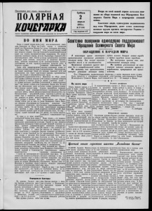к о т я т Орган профкома советских угольных рудников на Шпицбергене Пролетарии всех стран, соединяйтесь1 ПОЛЯРНАЯ «веавва аааяейй Суббота апреля 1955 г. №27 (814) Год издания 8-й Вчера по всей нашей стране началась кам пания но сбору подписей под Обращением Все- мирного Совета Мира о запрещении атомной войны. Советские люди, единодушно подписываясь под этим Обращением, дают слово самоотвер женным трудом крепить могущество Родины — твердыни мира во всем мире. В О И М Я М И Р А Вчера в пашей стране нача лась кампания по сбору под писей под Обращением Всемир ного Совета Мира о запреще нии атомного оружия. Она про ходит под знаком нерушимого единства советского народа, де монстрирующего свою непоко лебимую волю отстоять дело мира, добиться запрещения и уничтожения во всех странах атомного оружия, Среди всех международных вопросов, которые волнуют наро ды самых различных стран и континентов, нет более важ ного, чем вопрос о сокращении вооружений п запрещении атом ного оружия. Добиться запреще ния атомного и всякого друго го оружия массового уничтоже ния — это значит создать усло вия для обеспечения мира во всех странах земного шара. Советские люди испытали трагедию войны, видели ужасы бессмысленных разрушений, знают горе п страдания тех, кто лишился во время войны своих родных и близких. Вот почему сейчас они во весь го лос заявляют обезумевшим им периалистам: опомнитесь пока не поздно, знайте, что вы бу дете сметены с лица земли, если посмеете поднять руки на счастье нашей свободной жиз ни! От края и до края нашей необъятной Родины люди самых различных национальностей единодушно подписываются под Обращением Всемирного Совета Мира, требуют запрещения атомного оружия. Ставят свои подписи рабочие и акаде мики, колхозники и служащие, рыбаки и воины Советской Ар мии, юноши и девушки. Под писывая Обращение, они выра жают свою непоколебимую го товность отстаивать дело мира, укреплять могущество нашей социалистической Отчизны, вы полнить любую задачу, которая будет поставлена Коммунисти ческой партией и Советским правительством. С таким же единодушием по ставят свои подписи под Обраще нием к народам мира и поляр ники советских угольных руд ников на острове Шпицберген. Шахтеры и строители, транс портники и механизаторы, элек трики и работники коммуналь ных предприятий — все труже ники арктической кочегарки присоединят свой голос к го лосу многомиллионного совет ского народа о готовности до конца отстаивать дело мира. Сбор подписей вызвал новый трудовой и политический подъем среди полярников. На рудни ках Баренцбург, Грумант и Пи рамида организуются трудовые вахты за досрочное выполне ние производственных планов, повышение качества работ и снижение себестоимости. По лярники принимают новые со циалистические обязательства, в которых намечают пути для нового подъема производитель ности труда. Кампания по сбору подпи сей совпала с важным событием в жизни советских людей — подготовкой к международному празднику Первое мая. Во всех цехах наших рудников развер нулось предмайское социалис тическое соревнование. Приняв повышенные обязательства, гор няки, строители и рабочие дру гпх цехов добиваются осуще ствления их. Подписываясь под Обраще нием Всемирного Совета Мира, полярники подкрепят свои подписи самоотверженным тру дом, демонстр