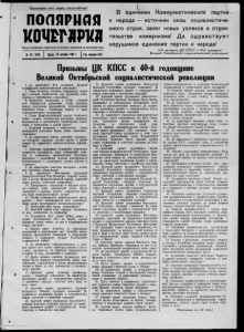 ■f; т полярная КОЧБГЛРКЛ Орган профкома советских угольных рудников на Шпицбергене Пролетарии всех стран, соединяйтесь! № 82 (1076) В единении Коммунистической партии и народа — источник силы социалистиче­ ского строя, залог новых успехов в строи­ тельстве коммунизма! Да здравст вует нерушимое единение партии и народа! (И з призывов ЦК КП СС к 40-й годовщине Великой Октябрьской социалистической революции). Призывы ЦК КПСС к 40-й годовщине Великой Октябрьской социалистической революции 1. Да здравствует 40-я годовщина Великой Октябрьской социалистической революции! 2. Слава Великому Октябрю, открывшему новую эру в истории человечества—эру крушения капи­ тализма и утверждения социализма! 3. Построение социализма в СССР — главный итог Октябрьской революции. Слава рабочему классу, колхозному крестьянству, интеллигенции Советского Союза — строителям первого в мире социалистического государства! 4. Слава Коммунистической партии Советского Союза — вождю Октябрьской революции, великому ■вдохновителю и организатору строительства социа­ лизма и коммунизма в нашей стране! 5. Марксизм - ленинизм — победоносное знамя Октябрьской революции. Выше знамя марксизма - ленинизма! 6. Да здравствуют советы депутатов трудящих­ ся—подлинно народные органы власти в нашей стране! Да здравствует социалистическая демокра­ тия! 7. Советские профсоюзы! Развивайте творческую активность трудящихся, шире мобилизуйте рабо­ чих в управление производством! Неустанно заботьтесь о дальнейшем подъеме материального благосостояния и культурного. уровня рабочих и служащих! 8. Да здравствуют советские женщины — актив­ ные строители коммунизма! ty' 9. Да здравствует Всесоюзный Ленинский Коммунистический Союз Молодежи—верный помощ­ ник, и резерв Коммунистической партии, передовой отряд молодых строителей коммунизма! 10. Превращение социализма в мировую систе­ му—главная черта современной эпохи. Пусть здравствует и крепнет великое содружество наро­ дов стран социалистического лагеря! 11. Боевая солидарность международного проле­ тариата — залог непобедимости дела социализма! Выше знамя пролетарского интернационализма! 12. Пролетарии всех стран, соединяйтесь! 1В. Братский привет всем народам, борющимся за мир, демократию, за социализм! 14. Трудящиеся всех стран! Войну можно и нужно предотвратить! Все на борьбу против опасности новой войны, за мир и сотрудничество между народами! Л 15. Народы мира! Боритесь за сокращение вооружений и вооруженных сил! Требуйте немед­ ленного прекращения испытаний и запрещения атомного и водородного оружия! Разоблачайте поджигателей войны! 16. Да здравствуют коммунистические и рабо­ чие партии всех стран—авангард рабочего класса и всех трудящихся, их братское сотрудничество в борьбе за мир, демократию и социализм! 17. Пусть крепнет единство трудящихся всех стран! Пусть ширится сотрудничество между ком­ мунистами, социалистами и всеми прогрессивными силами в борьбе за мир. демократию и независи­ мость народов! о 18. Братский привет великому китайскому (У народу — строителю социализма! Да здравствуют нерушимая дружба и сотрудничество советского и китайского народов — могучий оплот мііра во всем мире! 19. Братский привет трудящимся Народной Республики Албании, строящим социализм! Да здравствуют нерушимая дружба и сотрудничество