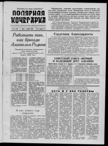 Пролетарии, всех, стран , соединяйтесь1 ПОЛЯРНАЯ тчтт Орган профкома советских угольных рудников на Шпицбергене №95 (1295) Среда, 2 декабря 1959 г. Год издания 12-й Рациональное, экономное расходование электроэнергии дол жно стать всенародным делом. Всенародный поход за выявление и использование резервов экономии электрической энергии, повсе дневная борьба с ее растранжириванием поставят на службу наро ду огромные энергетические ресурсы, сделают труд советского че ловека более производительным, позволят еще выше поднять жиз ненный уровень населения. (И з письма Центрального Комитета Коммунистической партии Со ветского Союза партийным , советским, хозяйственным, профсоюзным и комсомольским организациям, трудящимся предприятий промышлен ности, транспорта, строек, колхозов и совхозов, научно-исследователь ских и проектных институтов, конструкторских бюро, культурно-бы товых учреждений, совнархозов, министерств и ведомств). Работать так, как бригада АнатолияРодина Передовой коллектив перевыполнил свои обязательства: вместо 1700 тонн сверхпланового угля і выдано 2200 тонн В начал е эт о г о года, к о гда о б с у ж д а л и с ь со ц и а л и с т и ч е с к и е о б я з а т е л ь с т в а к олл ектива , многим в Ба- р енц б ур г е п о к а з а л о с ь н е сбы т очным р еш е н и е г ор н о р а б о ч и х бригады Анатолия Родина д о бы т ь к к онц у г о д а 1700 тонн с в е р х п л а н о вого угля. — Не вытянут. Такая циф ра, в то время как у бри га д ы — спл ош ны е м и н у сы ,— у т в е рж д а л и т о г д а м а л о в е ры. 23 ноября — 153,6 24 ноября — 130,9 25 ноября — 183,6 26 ноября — 147,2 27 ноября — 130,9 28 ноября — 136,3 З а д а н и е 28 д н е й ноября бы л о вып олн ен о на 147,1 пр оц ен та и вы д ан о с в е р х программы 1191 т онн у уг ля. Таким о бр а зом , т еп ерь на сч е т у бригады у ж е им е е т ся 2200 тонн топлива д о п о л н и т е л ь н о к зад анию . О б я за т е л ь с т в о пр евыш ен о на 500 тонн. — Мы м ож ем р а бо т а ть ещ е л учш е,—заявил р у к о в о д и т е л ь п е р е д о в о г о к о л л ектива Анатолий Р один .— Плохо, что уч а ст ок внут- риш ах тн о го тран спор т а в д о с т а т к е не о б е с п е ч и в а е т нас п ор ожня к ом . П о с л е д них д в а дн я н е д е л и мы много вр емени потеряли из-за п р о с т о е в п о эт ой при чине. Над о полагать, что руко- Но ж и з н ь пок а зала , что эти о б я з а т е л ь с т в а по плечу горнякам . Они у с п еш н о п р е о д о л е л и о т с т а в а н и е и з а 10 м е с я ц е в д а л и почти эш е л о н д о п о л н и т е л ь н о г о топлива. С о с о бы м н апряж ени ем т р у д и т с я к олл ек тив в н о я бр е, н е с я в а х т у в ч е ст ь Дня К он стит уции и Пл ену ма ЦК КПСС. Вот как р а бо т а ли ш а х т еры бри гады п о с л е д н ю ю н е д е лю : процента, проц ент а , процента, процента, процента, процента плана. во ди т ел и рудник а Бар енц- бург примут меры к тому, ч т обы г о р н о р а б о чи е в с е х б ри г а д могли р а б о т а т ь в п олн ую силу. Трудить ся так, как бри г а д а Анатолия Родина, м ож е т и д о л ж е н к аж ды й к о л л е к тив, принимая р еш и т е л ь ные меры н е т о л ь к о д л я вып олн ения плана, но и в зяты х о б я за т ел ь ств . Товарищи полярникиі По примеру передовиков нас тойчивее боритесь за даль нейший рост производитель ности труда, увеличение вы пуска продукции,улучшение ее качества и снижение се бестоимости! Подготовим достойную встречу Дню Конституции и предстояще му Пленуму ЦК КПСС! Ж ~ В счет второго года семилетки Будто соперничая с полоса ми северного сияния, во ть