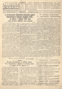 Пролетарии всех стран, соединяйтесь/ Год Издания 13-Й п о л я р н ы й Орган б-го отделения движения, паровозо электровозного хозяйства и районного комитета профсоюза железнодорожников Кировской жел. дор. ’944 год 20 АПРЕЛЯ Четверг № 32(1384) Цена 16 коп. НКПС призывает желе знодорожников еще шире развернуть предмайское социалистическое соревнова ние и тем самым помочь наступающей Красной Армии в ее героической борьбе по разгрому и изгнанию с родной советской земли ненавистных немецко-фашист ских захватчиков. (И з приказа Народного Комиссара Путей Сообщения тов. Л . М. Кагановича о присуждении Кировской жел. дор. переходящего Красного Знамени НКПС за работу в марте 1944 г.) Оприсуждении Кировской железной дороге переходящего КрасногоЗнамени НКПС за работу в марте1944 года ПРИКАЗ НАРОДНОГО КОМИССАРА ПУТЕЙ СООБЩЕНИЯ 17 апр еля 1944 года Решением ВЦСПС и НКПС по итогам Всесоюзного социалистического сорев нования за март 1944 года коллективу Кировской дороги присуждено перехо дящее Красное Знамя НКПС. Дорога ус- HfeuiHO справилась с выполнением спе циальных заданий НКПС и выполнила государственный план погрузки, в том числе по воинским грузам, регулиро вочное задание НКПС по сдаче порож- ■яка выполнено на 116 процентов. В ходе социалистического соревнова ния лучших результатов добились па ровозное депо Сумпосад и Кемское от деление паровозного хозяйства и депо Кемь, которые, несмотря на сложные условия работы, успешно выполнили ос новные производственные показатели. Улучшение в работе Кировской до р о г и - р е з у л ь т а т патриотического стрем ления передовых людей честно и до кон- иа выполнить свой долг перед Родиной х обязательства, данные железнодорож никами в письме Великому Маршалу Со ветского Союза товарищу Сталину, что «месте с тем свидетельствует о возрос шей организованности в работе, о вов лечении в соревнование широких масс рабочих, командиров и служащих. Но эти первые успехи не могут и не должны заслонить имеющиеся недостат- ки в деятельности отдельных предприя тий и дороги в целом. Надо с еще боль шей настойчивостью и самокритичностью вскрывать недостатки и принимать ме ры к их немедиенному устранению. Толь ко такой подход к делу поможет коллек тиву и его руководителям подтягивать отстающие звенья и добиться дальней шего под' ема в работе. / в 348 Отмечая достигнутые в марте успехи в работе дороги, II Р И К А 3 Ы В А Ю: 1. Начальнику дороги т. Гарцуеву , начальникам служб и всем руководите лям предприятий широко раз' ясиить на собраниях рабочих и служащих реше ние ВЦСПС и НКПС о присуждении до роге за работу в марте переходящего Красного Знамени, мобилизовав коллек тив на успешное выполнение задач, по ставленных в приказах № 173-Ц от 6 февраля 1944 г. и ,N*9 316-Ц от 1 апреля с. г. Закрепить достигнутые в марте ре зультаты и добиться дальнейшего улуч шения в работе дороги. 2. Об' явять благодарность всем ра ботникам Кировской ж. д. и лично на чальнику дороги генерал-директору дви жения III ранга т. Гарцуеву. 3. Начальнику дороги и руководите лям служб и предприятий сосредоточить основное внимание На безусловном вы полнении государственного плана по- ^рузки, особенно импортных грузой. дров и лесоматериалов. Коллектив дороги должен быть мобилизоран на борьбу за улучшение качественных показателей, использование подвижного состава с тем, чтобы довести оборо