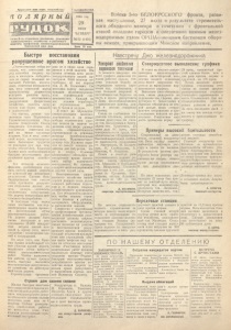 Пролетарии всех стран. соединяйтесь! п о л я р н ы й Г ед падания 13-й Орган б-го отделения движения, паровозо электровозного хо зяй ства и районного комитета профсою за железнодорожников Кировской жел. дор. 1944 год 29 июня ЧЕТВЕРГ № 52 ( 1404 ) Цена 15 коп. Войска 3-го БЕЛОРУССКОГО фронта, разви вая наступление, 27 июня в результате стремитель ного обходного маневра в сочетании с фронтальной атакой овладели городом и оперативно важным желез нодорожным узлом OPLIJA—мощным бастионом оборо ны немцев, прикрывающим Минское направление. Быстро восстановим разрушенное врагом хозяйство „Отечественная война по казала, что советский на род способен творить ч у деса и выходить победите лем из самых тяжелых ис пытаний. Рабочие, колхоз ники, советская интеллиген ция, весь советский народ преисполнены решимости ускорить разгром врага, полностью восстановить разрушенное фашистами хозяйство, сделать нашу страну еще более сильной и зажиточной. “ Эта оценка, данная тру женикам тыла Верховным Главнокомандующим Мар шалом Советского Союза товарищем Сталиным, во одушевила советских лю дей на новые трудовые подвиги. Как и весь совет ский народ железнодорож ники Заполярья трудятся не покладая рук над тем, чтобы обеспечить Красную Армию всем необходимыми быстрее восстановить раз рушенное врагом хозяйст во. Все попытки немецко- финских разбойников сор вать работу нашей дороги не принесли им желаемых результатов. Своими бом бардировками они смогли лишь причинить разруше ния отдельных жилых до мов, казарм, вокзалов, технических сооружений. Но дорога продолжала дей ствовать бесперебойно. В текущем году перед нами поставлена как пер воочередная задача провес ти значительный об‘ем восстановительных работ. На дороге должно быть вновь построено и вос становлено 15.000 квадрат ных метров жилой пло щади и, кроме того, много служебно -технических зда ний и сооружений. По мере того, как Крас ная Армия освобождает но вые участки нашей дороги, возрастает об‘ем предсто ящих восстановительных работ. Чтобы выполнить эти работы, нужно прежде всего, быстрее закончить восстановление разрушенно го хозяйства на действую щей части дороги. Строительные организа ции не в силах одни спра виться с этой задачей. Им нужна помощь всех желе знодорожников нашей ма гистрали. Этой помощи по требовал от нас нарком тов. Л. М. Каганович. Он поставил задачу овладения каждым железнодорожни ком строительной спе циальностью. Каждый из нас должен отработать на строительных рабо тах 8 часов в неделю. В ответ на обращение северо-донецких железно дорожников и на новые победы героических крас ных воинов на нашем от делении еще шире развер нулось социалистическое соревнование за усиление помощи освобожденным участкам. Машинист-инст руктор тов. Кулигин выде лил из своего личного хо зяйства две табуретки, пи лу и колун. Кузнецы электродепо обязались во внеурочное время изгото вить набор кузнечного инструмента. Их примеру следуют железнодорожники и других служб узла. Восстановление разру шенного хозяйства нашей дороги должно стать делом каждого работника отделе ния и в первую очередь хозяйственного руководите ля. Его обязанность сделать все, чтобы оказать строи телям помощь в рабсиле, материалах, оборудовании, в выполнении заказов. Совместно с партийными и профсоюзными организа циями хозяйствен