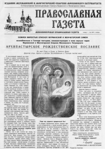 ИЗДАЫИе Л Х \PMAHGKOft и Мончегорской 6 ПЛРХИИ МОСКОВСКОГО ПАТРИАРХАТА По благословению Преосвященнейшего Епископа Мурманского и Мончегорского Симона ПРАВОСЛАВНАЯ ГА36ТА Л/ШССИОН6РОКАЯ ПРАЕОСЛАЕЫАЯ ГАЗЕТА номер 1, год 2001, январь БОЖИЕИ МИЛОСТЬЮ ЕПИСКОП МУРМАНСКИЙ И МОНЧЕГОРСКИЙ СИМОН возлюбленным о Господе пастырям, монашествующим и всем верным чадам Мурманской и Мончегорской Епархии Московского Патриархата АРХИПАСТЫРСКОЕ РОЖДЕСТВЕНСКОЕ ПОСЛАНИЕ Во имя Отца, и Сына, и Святого Духа! Дорогие отцы, братья и сёстры! Возлюбленная о Господе паства моя! В наступивший первый год ново го века и нового тысячелетия при- имите моё сердечное поздравление с радостным и светлым Христовым Рождеством. Как и каждый год из всех двух тысяч лет предшествующих, ныне, в две тысячи первом году, несмотря на всевозможные самые пессимис тические прогнозы, ожидания, катак лизмы, нам, людям, снова открыва ется спасительная тайна Божествен ного Воплощения. К нам снова на Землю рождается Христос. Он яв ляется в Своём первом, радостном и счастливом младенческом Прише ствии, а не втором и страшном, как Судья. Приходит Он, чтобы привес ти нас, всё человечество, в совер шенный духовный возраст и разор вать покров, наброшенный на поту сторонний мир. Чтобы открыть и разделить со всеми нами средь на ших необъятных скорбей-страданий Своё Небесное Царство и радость безграничную. Чтобы вселить в нас Свою спасительную веру, надежду и любовь. Он снова, как и раньше, увещевает нас: - Веруйте! Любите! Да будет доб рая надежда душой всей вашей жиз ни! Ибо над нами, над землёй, су ществует иной, духовный мир и иная, совершенная жизнь. Христос даёт нам этот мир и эту жизнь. Он посвящает, приводит нас туда. Для благодатного обожения челове ка усыновляет Он человеку Своё Божество. Для возрождения жизни в глубинах смерти Он открывает Небо. Свет Истины через Хри ста сияет нам по всей земле. Бог раскрыва ется путём неизреченной жертвенной любви. «Из чрева прежде денницы подобно росе рождение Твое» (Пс.109, 3). Сейчас, как и две тысячи лет назад, на земле совершается величайшее Таинство че ловечества. Дева рождает Того, Кто создал весь наш мир, Кто существует прежде какого- либо создания, прежде самого мира, космо са. Наша планета Земля принимает Его, даёт Ему своё жилище - убогий вертеп. И ангелы, и люди неустанно приветствуют, восхваляют как само это Событие, так и Виновника его. А мудрецы, как всегда, преданно устремлены Ради нас родился предвечный Бог! И каждое проявление жизни, каждая сфе ра её устремляется к своей высшей сфере, к родившемуся на землю Всевышнему Богу. Но если всё то, что мы относим к неживой и неразумной природе, стремится к Богу бес сознательно, инстинктивно, то нам, разумным существам, надлежит совершать это весьма достойно, благородно и свободно. Наш удел, наш девиз - отыскать бесконечно великое в малом - Великого Бога в Младенце Христе, почувствовать Его реальное присутствие и вместить Невместимого в наш собственный убогий вертеп - своё сердце, что значит, по слову премудрого Иисуса, сына Сирахова, исполниться Христову рождению в нас. Для иногда даётся нам краткий миг (Сир. 24, 21-25). Этот таинственный миг наступил в настоящее время. Готовы ли мы принять Христа? Есть ли у нас в глубине души для Него Одного место? Или нам так хочется одновременно иметь и Бога, и вещественное, тварное в с