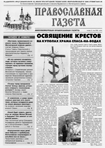 11Г5Д< Д1 1Л\ > Г *1 /1 іЛ 11Ѵ І \ѴГ1 *1 <II LV 1I '1 \> 1 Ѵ Г Ѵ Л Ѵ И \> 1 І 6Ѵ Г Л Г 1П r f l/ lV V r JW JS lr lW l V И Л 1 По благословению Преосвященнейшего Епископа Мурманского и Мончегорского Симона Ш і Т І МИОСИОНвРСКАЯ ПРАЕООЛАВНАЯ ГАЗвТА номер 6, год 2002, июнь ЧИТАЙТЕ В НОМЕРЕ: «Фестиваль православного хо рового пения в Мурманской и Мончегорской епархии удался», - считает владыка Симон. Статья Галины Сиротинской о праздновании дня памяти святых равноапостольных Кирилла и Мефодия............................... стр. 4 «Во все времена находились люди, которые пытались спеку лировать на переписи населения, стращая народ жуткими послед ствиями». Интервью с Управляющим делами Московской Патриархии, членом Госкомиссии по подготовке и про ведению Всероссийской переписи населения митрополитом Солнеч ногорским Сергием............. стр. 2 «Почему перед праздником Святой Троицы Церковь устано вила совершать поминовение усопших?» Беседы иерея Василия Вольского о право славном благочестии.......... стр. 3 «К сожалению, и среди право славных христиан есть много таких, которые попадаются даже на самую дешевую авантюру». На вопросы читателей отвечает епископ Симон.....................стр. 8 «Какой будет смерть, удосто ится ли человек Жизни Вечной в будущем ? Это зависит от его земной жизни». Наш постоянный автор Елизавета Анциферова делится переживания ми и впечатлениями о своей работе в Хосписе............... стр. 5 «Благословляли своих детей наши бабушки и прабабушки, благословение сопровождало от колыбели всю их жизнь». Продолжаем разговор о силе материнской молитвы и благословения......................стр. 2 ОСВЯЩЕНИЕ КРЕСТОВ НАКУПОЛАХХРАМАСПАСА-НА-ВОДАХ 3 июня, в день праздника чудотворной Влади мирской иконы Божией Матери, великой святыни Руси, состоялось освящение крестов на куполах нового храма. Церковь, построенная в традициях Владимиро-Суздальской и Московской Руси, слов но былинный богатырь, возвышается над городом неподалеку от Семеновского озера. Освящал купола и кресты по благословению нашего правящего архиерея епископа Симона иеро монах Меркурий (Горбов). Перед началом молеб на отец Меркурий напомнил, что сегодня день празднования Владимирской иконы, перед кото рой Русь молилась несколько веков, получая помощь и защиту от врагов заступничеством М а тери Божией. «Но и год назад, - сказал он, - 6 июля, когда на месте закладки храма соверша лась литургия с архиерейским служением, был также день праз днования Владимирской иконы! Оказалось, что день освящения в этом году выбран не еписко пом, а строителями, то есть как бы случайно. Но случайностей в нашей жизни нет, во всем Промысел Божий. И мы ясно ощущаем покров Божией М а те ри в этом святом деле. 3 июня Святая Церковь праз днует также память святых рав ноапостольных Константина и Еле ны, первых христианских госуда рей Римской империи. В IV веке святая Елена обрела в Иеруса лиме Крест, на котором был рас пят Спаситель. А ее сын, импе ратор Константин, увидел знаме ние Креста на небе и слова «сим победиши». И мы сегодня собра Проповедь отца Меркурия после чина освящения лись, чтобы освятить кресты нового храма. Молит ва в нем объединит всех нас, как всегда соединяет людей вера». Некоторые из присутствующих на освящении за метили, что лежащие неподалеку и сверкающие золотом купола похожи на шлемы витязей. «Да, - подтвердил отец Меркурий, - так издревле задумы валась 