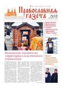 М и с с и о н исеио 1 рер , сса Д як р К ааос Б ля н Ь ая 2 га 0 зе 1 т 8 а авославная газета № 12 ДЕКАБРЬ 2018 П ериод ическое издание М ур м анской и М о нчегорской епархии М о ско вско го патриархата, издается с 1998 года Освящ ение часовни на территории следственного управления 21 ноября 2018 года, в день памя ти Архистратига Михаила и про чих Небесных Сил бесплотных, митрополит Мурманский и Мон чегорский Симон совершил чин освящения часовни, возведенной Следственным комитетом РФ по Мурманской области на террито рии управления. На чине освящения присут ствовали руководитель Отдела Мурманской епархии по взаимо действию с Вооруженными Сила ми и правоохранительным органа ми РФ настоятель храма Спаса на водах протоиерей Андрей Амелин, почетные гости из Москвы: пред седатель Синодального отдела по взаимодействию с Вооруженными Силами и правоохранительны ми учреждениями РФ протоиерей Сергий Привалов и помощник председателя Борис Михайлович Лукичев, также руководитель и офицеры следственного управ ления Следственного комитета Российской Федерации по Мур манской области, представители общественных советов и органи заций. Стройным молитвенным пени ем чин освящения сопровождал мужской состав клиросного хора мурманского морского храма Спа са на водах под руководством ре гента диакона Ильи Слащенко. По окончании чина Высоко- преосвященнейший Симон обра тился ко всем присутствующим со словом поздравления, архипа стырского назидания и пожелал помощи Божией в нелегком слу жении Отечеству и борьбе со злом. — Дай Бог, чтоб очаги нашей правой веры, такие, как часовни, как храмы Божьи, как храмы — светлые души отдельных людей, появлялись и распространялись. Это даст нам подлинное счастье, это сделает нашу жизнь и полной, и прекрасной, и радостной. А нас в жизни сделает сильными, разум ными, мудрыми, достойными зва ния и человеческого, и христиан ского, — отметил митрополит. Новоосвященной часовне вла дыка Симон передал в дар икону Архистратига Михаила. Председатель Синодального отдела по взаимодействию с Во оруженными Силами и правоох ранительными учреждениями РФ протоиерей Сергий Привалов тор жественно вручил руководителю следственного управления Андрею Ефремову грамоту за укрепление духовных и нравственных основ служения Отечеству. Ирина КОРНЕВА Представители Мурманской и Мончегорской епархии приняли участие в фестивале «Вера и Слово» стр. 2 Первая православная интеллектуально познавательная викторина стр. 4